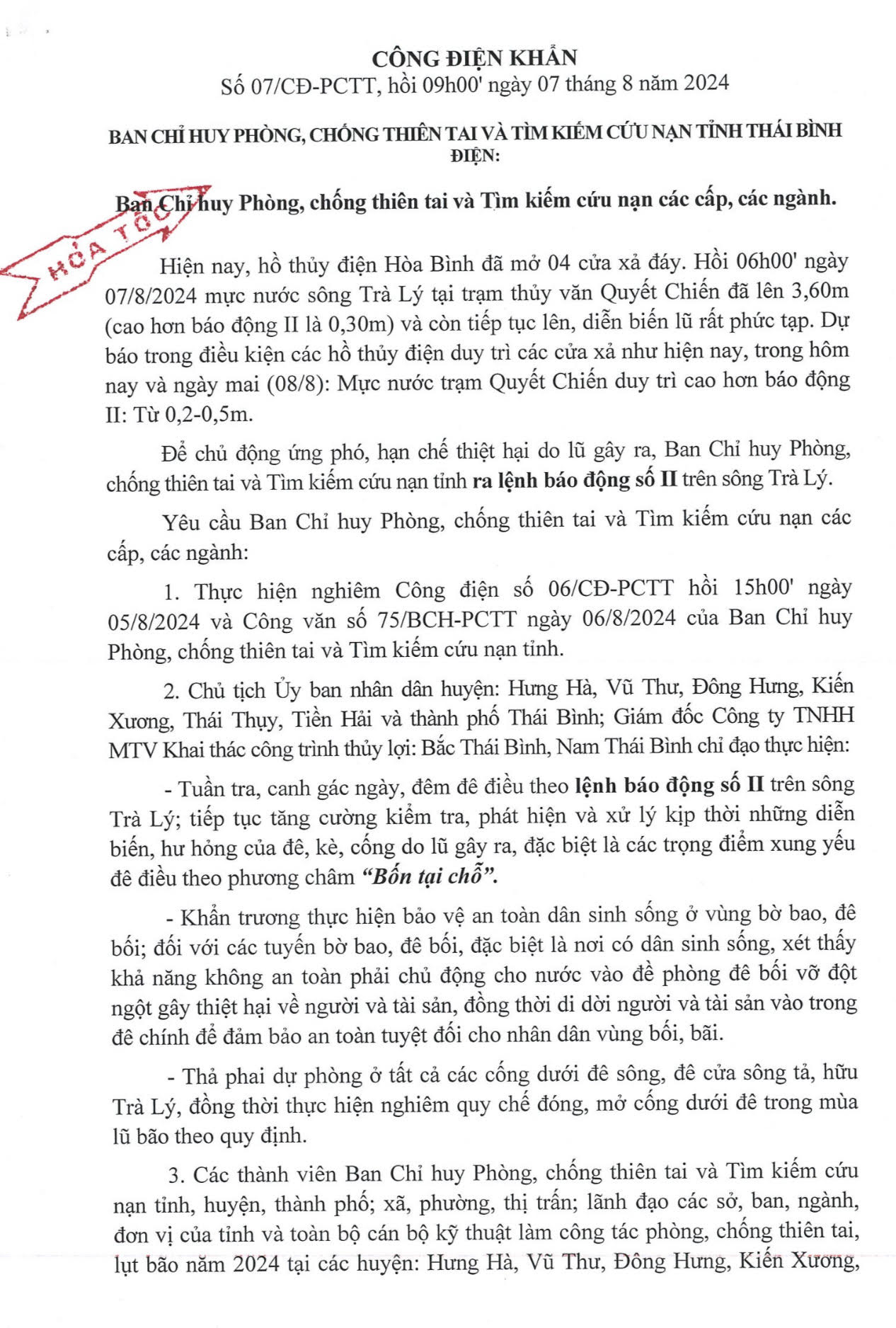 Công điện khẩn số 07/CĐ-PCTT của Ban Chỉ huy Phòng, chống thiên tai và Tìm kiếm cứu nạn tỉnh Thái Bình điện Ban Chỉ huy Phòng, chống thiên tai và Tìm kiếm cứu nạn các cấp, các ngành. Nội dung công điện khẩn như sau: