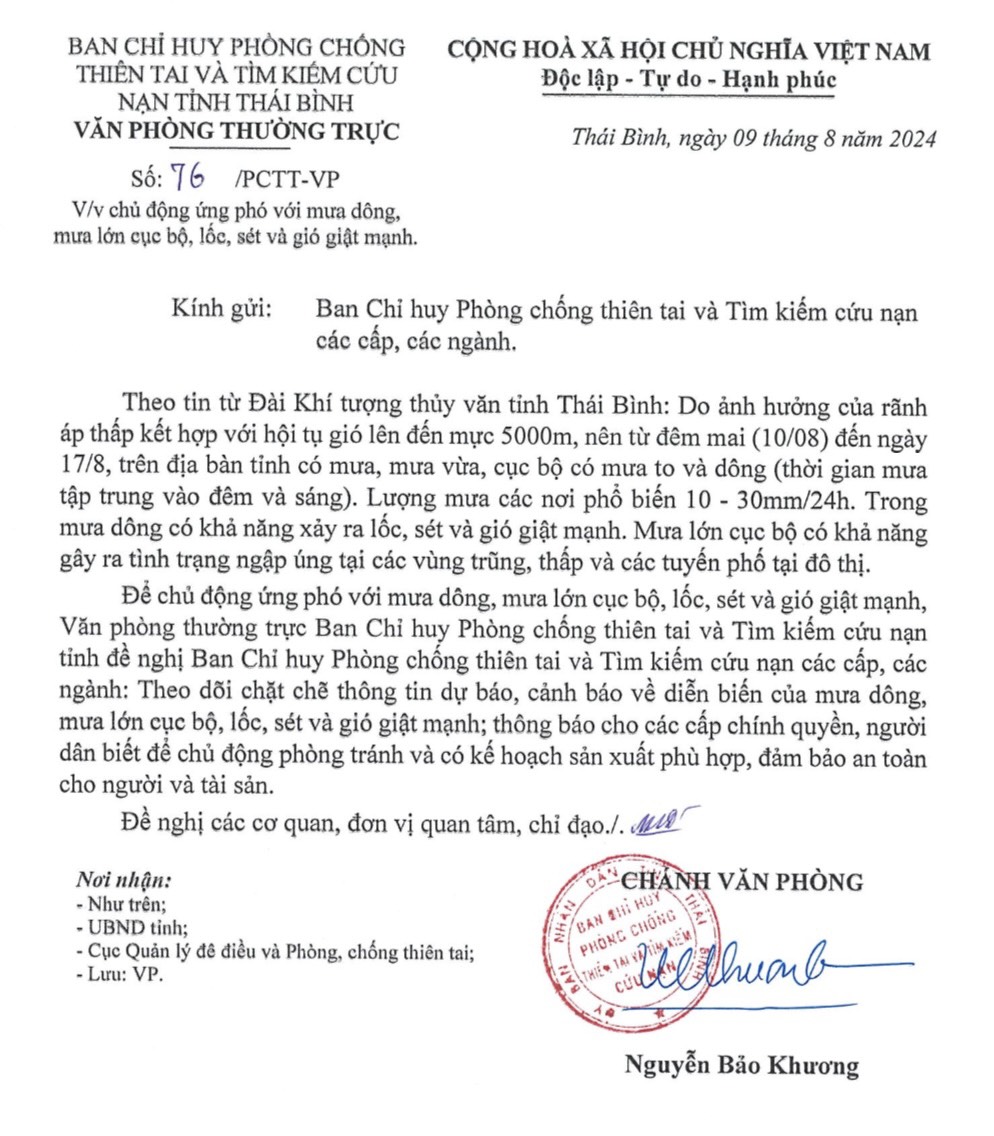 Ngày 9/8, Ban Chỉ huy Phòng, chống thiên tai và Tìm kiếm cứu nạn tỉnh Thái Bình có Công văn số 76/PCTT-VP về việc chủ động ứng phó với mưa dông, mưa lớn cục bộ, lốc, sét và gió giật mạnh. Nội dung công văn như sau: