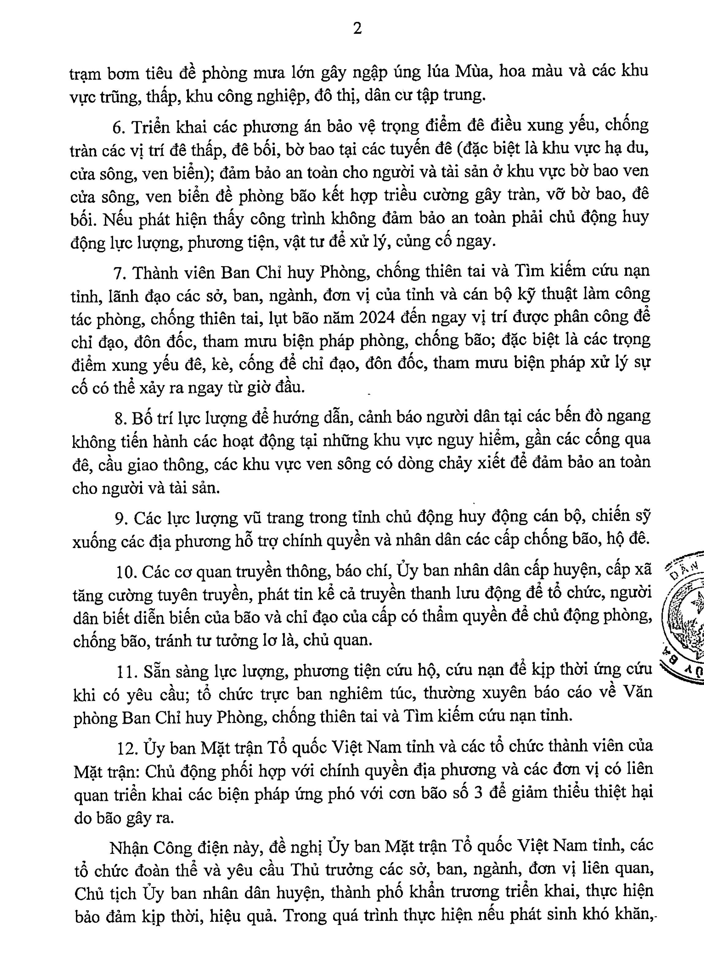 - Công điện khẩn số 10 của Ban chỉ huy PCTT và TKCN tỉnh Thái Bình điện Ban chỉ huy PCTT và TKCN các cấp, các ngành 03.09.2024 | 22:24 PM