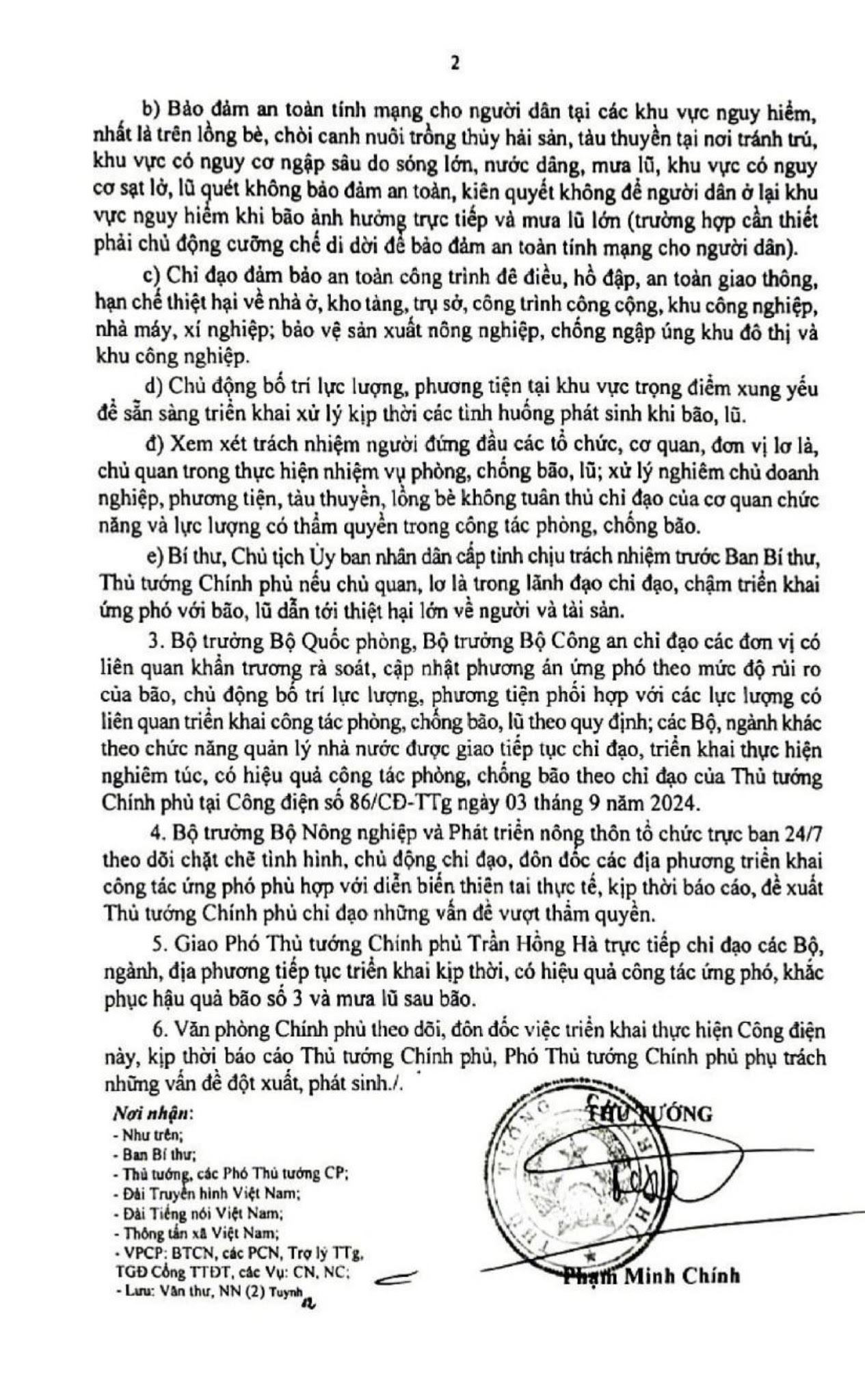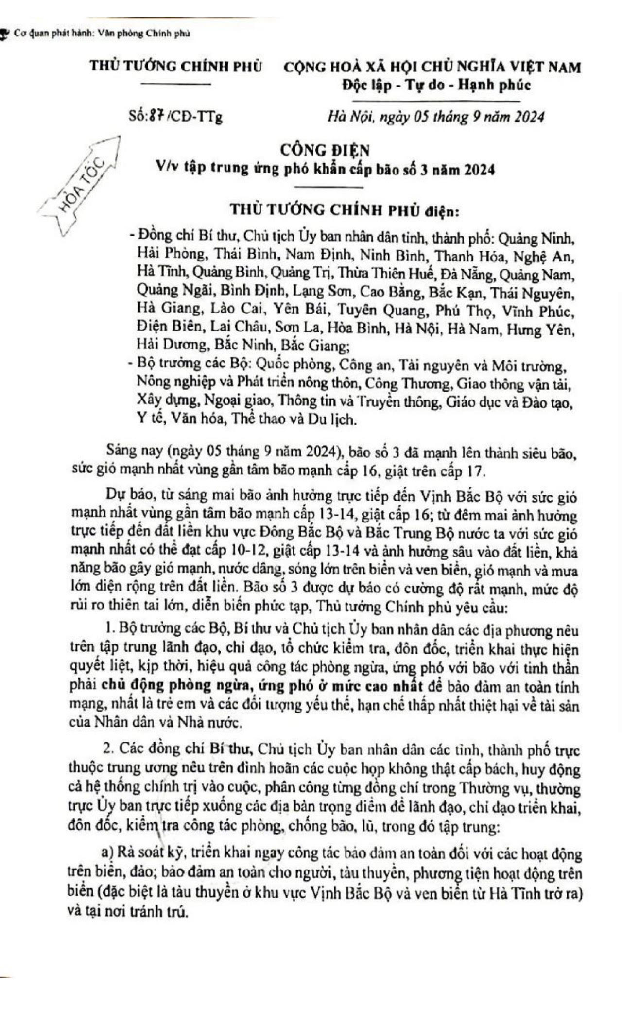 Công điện của Thủ tướng Chính phủ về việc tập trung ứng phó khẩn cấp bão số 3 năm 2024