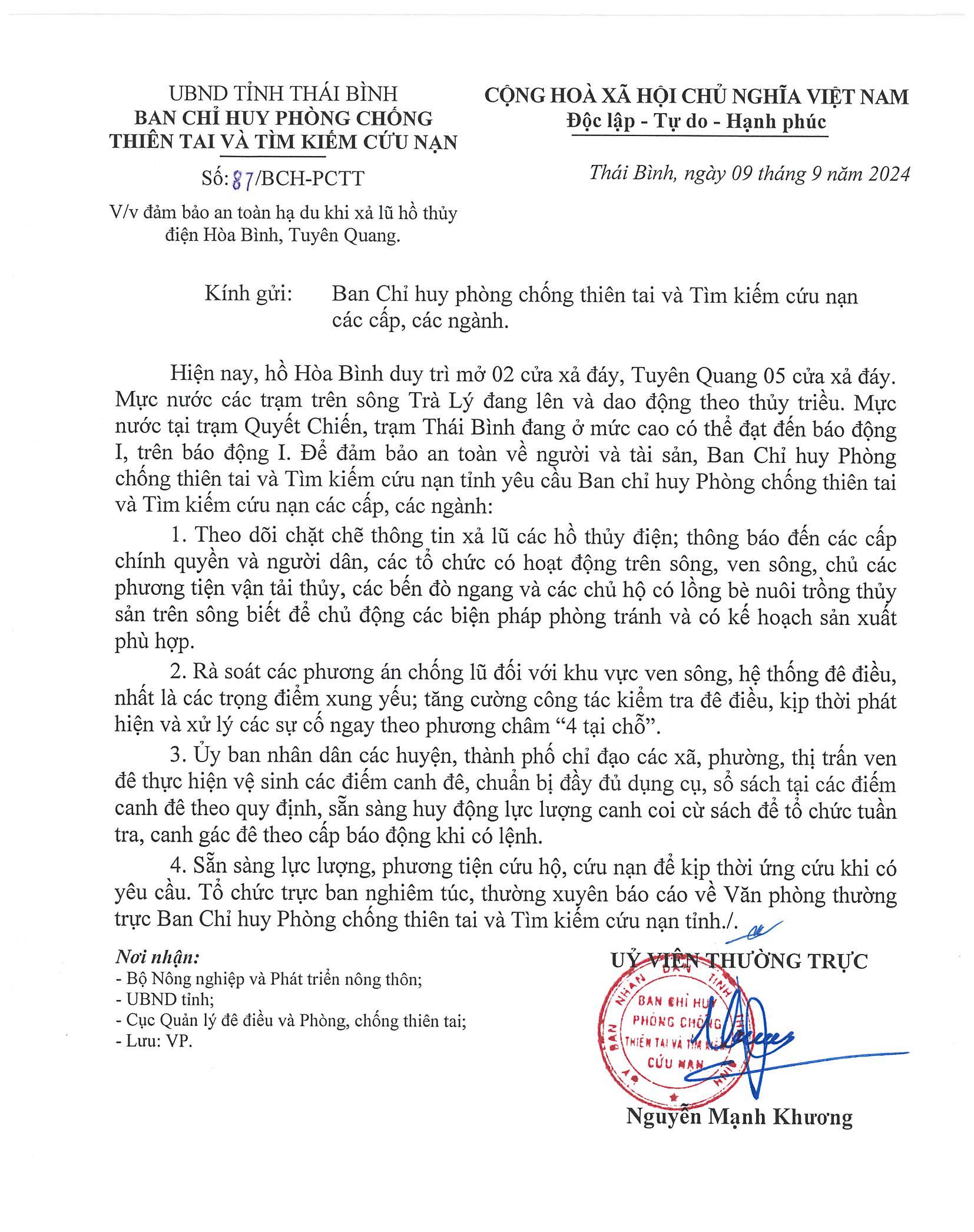 - Công điện khẩn số 10 của Ban chỉ huy PCTT và TKCN tỉnh Thái Bình điện Ban chỉ huy PCTT và TKCN các cấp, các ngành 03.09.2024 | 22:24 PM
