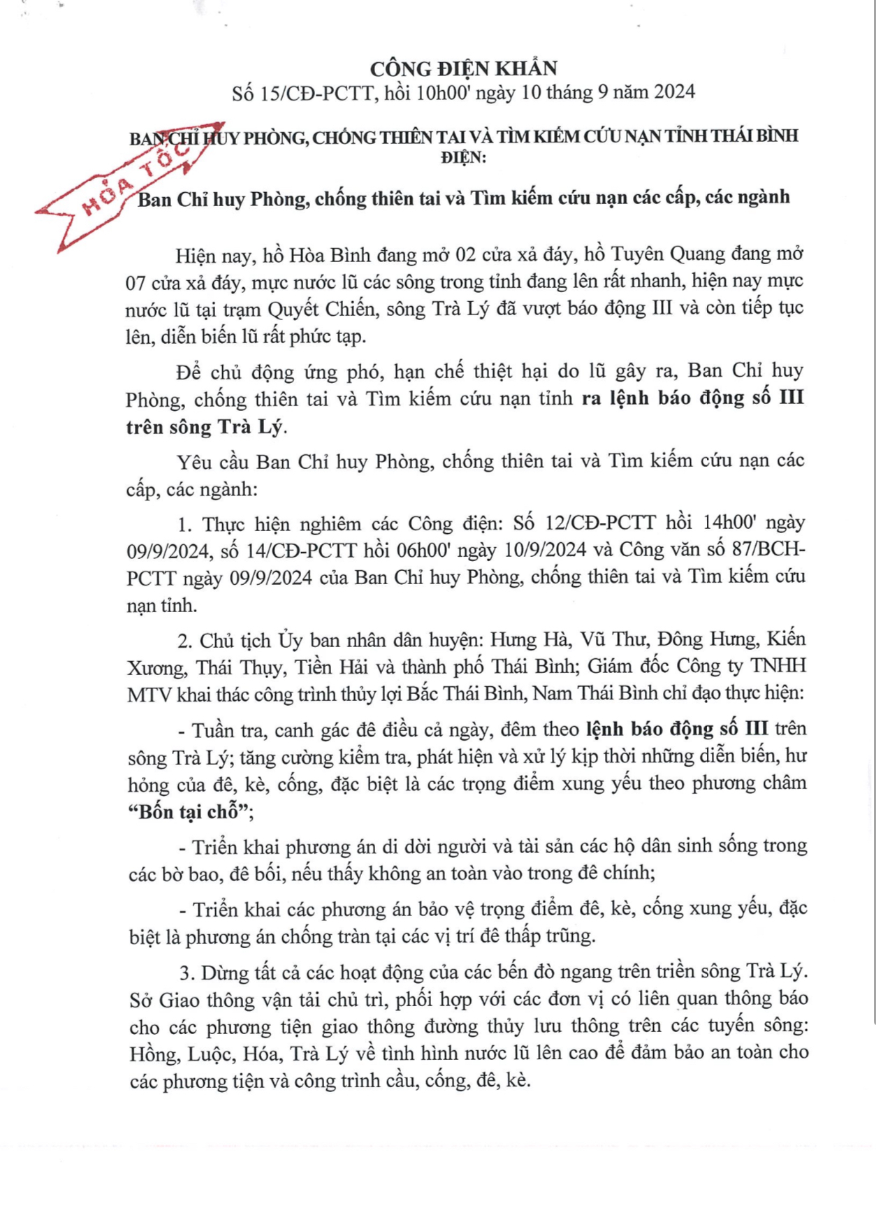 - Công điện khẩn số 10 của Ban chỉ huy PCTT và TKCN tỉnh Thái Bình điện Ban chỉ huy PCTT và TKCN các cấp, các ngành 03.09.2024 | 22:24 PM