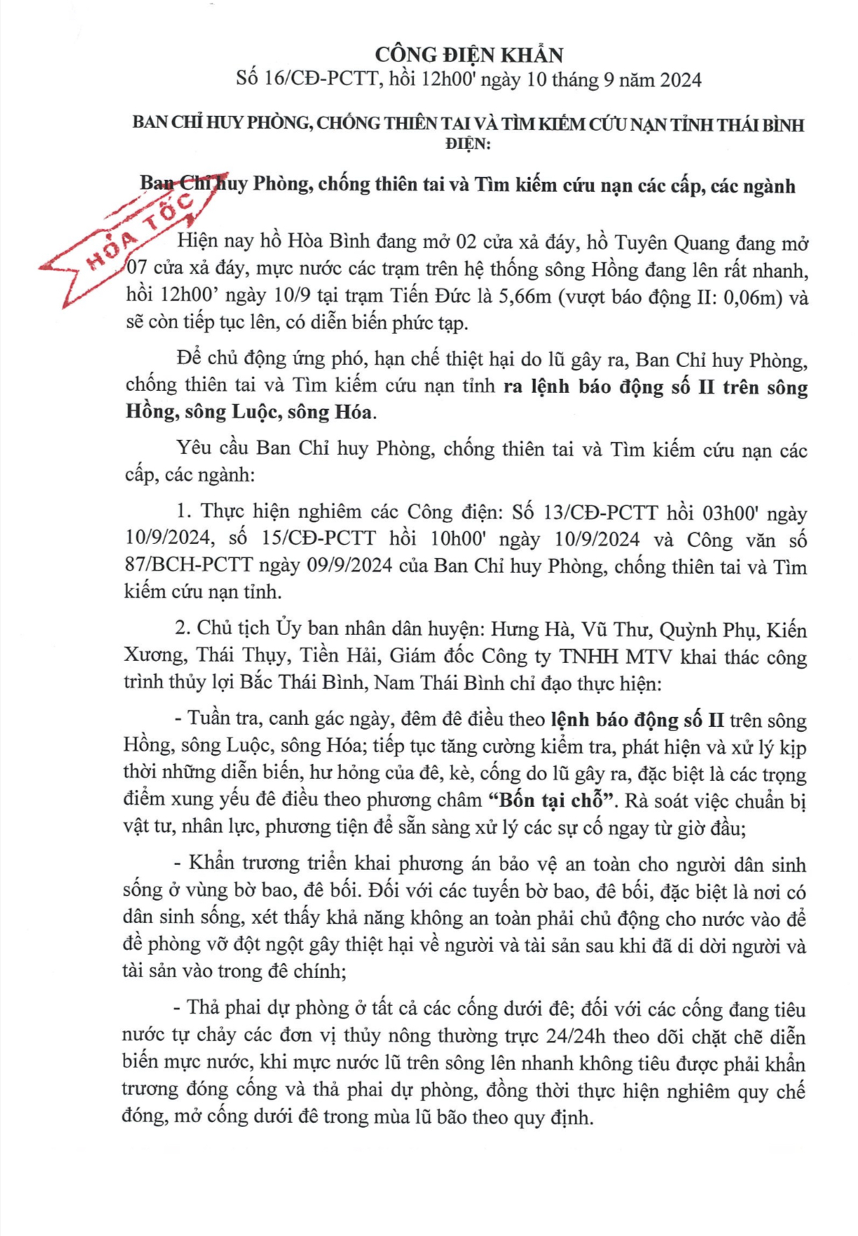 - Công điện khẩn số 10 của Ban chỉ huy PCTT và TKCN tỉnh Thái Bình điện Ban chỉ huy PCTT và TKCN các cấp, các ngành 03.09.2024 | 22:24 PM