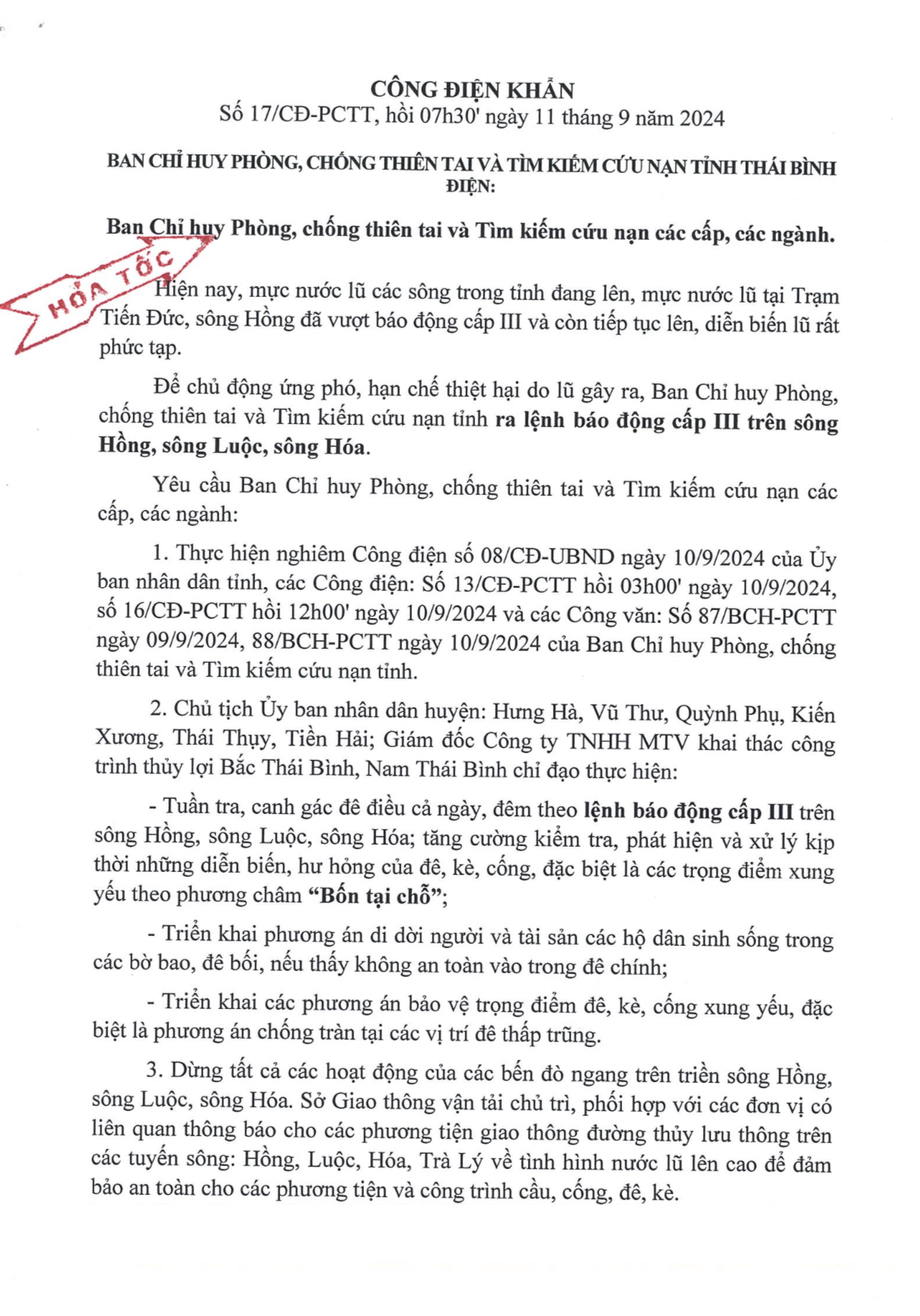 - Công điện khẩn số 10 của Ban chỉ huy PCTT và TKCN tỉnh Thái Bình điện Ban chỉ huy PCTT và TKCN các cấp, các ngành 03.09.2024 | 22:24 PM