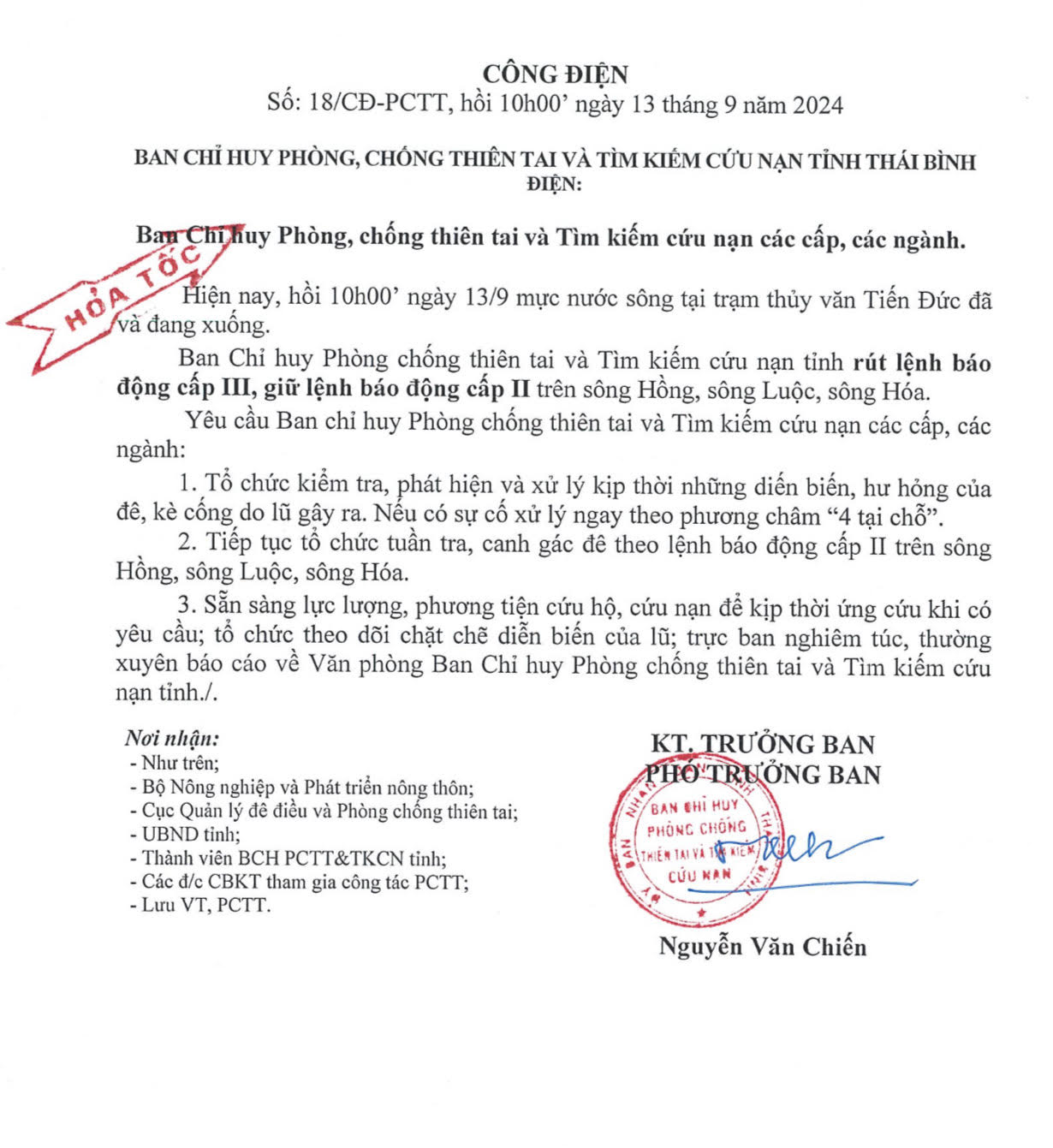 - Công điện khẩn số 10 của Ban chỉ huy PCTT và TKCN tỉnh Thái Bình điện Ban chỉ huy PCTT và TKCN các cấp, các ngành 03.09.2024 | 22:24 PM