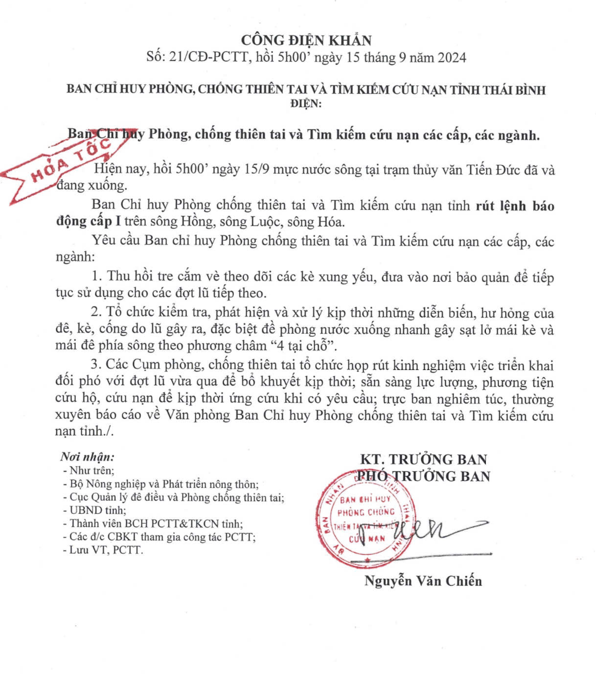 - Công điện khẩn số 10 của Ban chỉ huy PCTT và TKCN tỉnh Thái Bình điện Ban chỉ huy PCTT và TKCN các cấp, các ngành 03.09.2024 | 22:24 PM