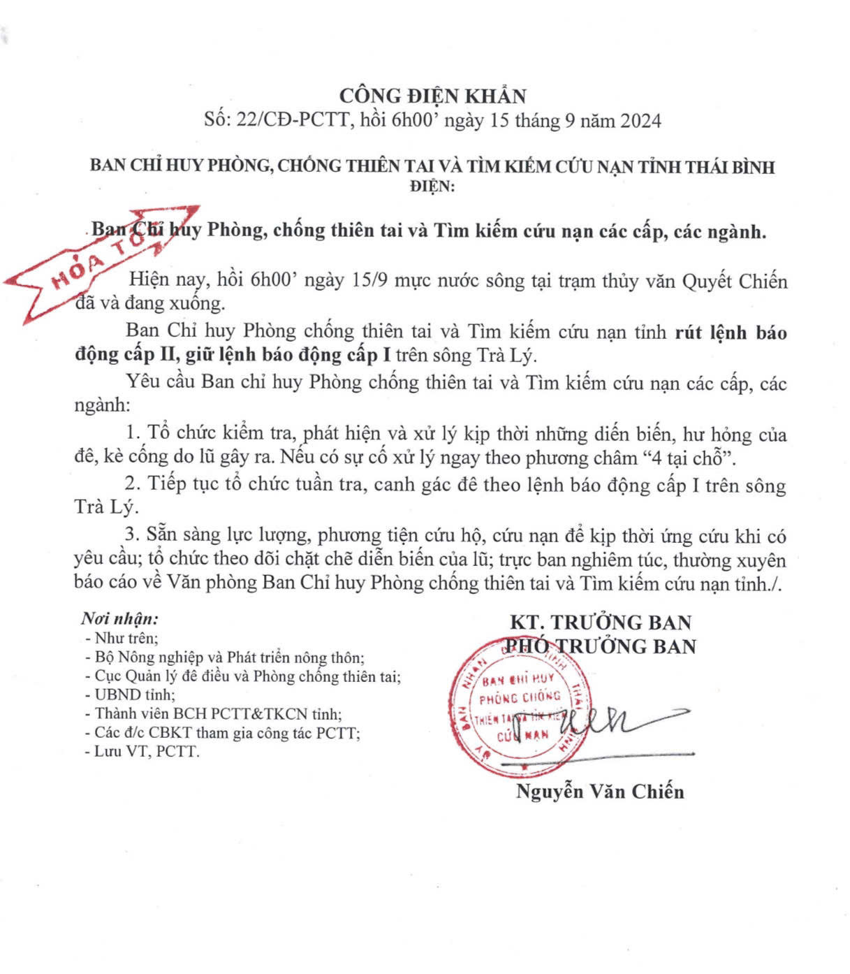 - Công điện khẩn số 10 của Ban chỉ huy PCTT và TKCN tỉnh Thái Bình điện Ban chỉ huy PCTT và TKCN các cấp, các ngành 03.09.2024 | 22:24 PM