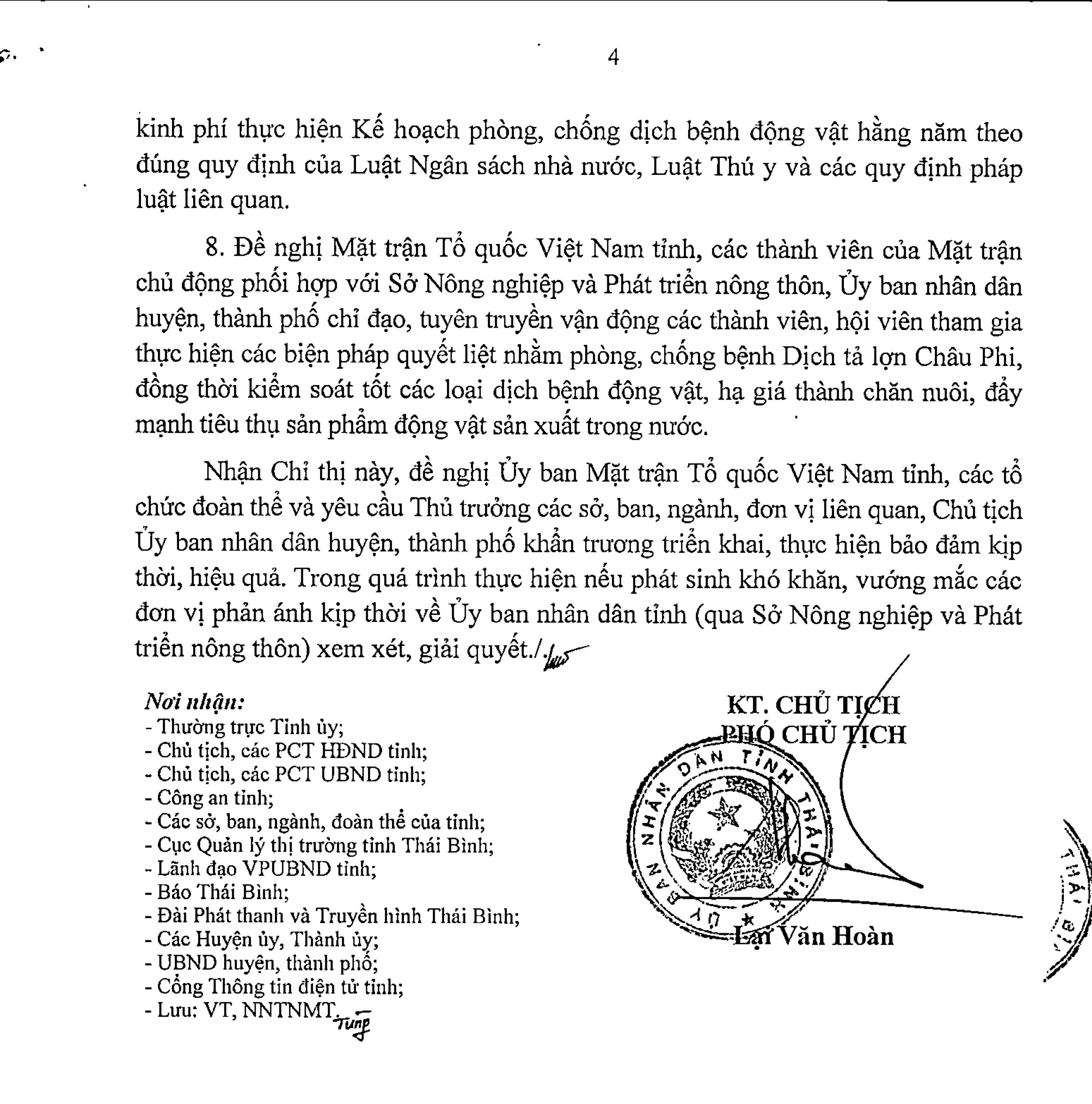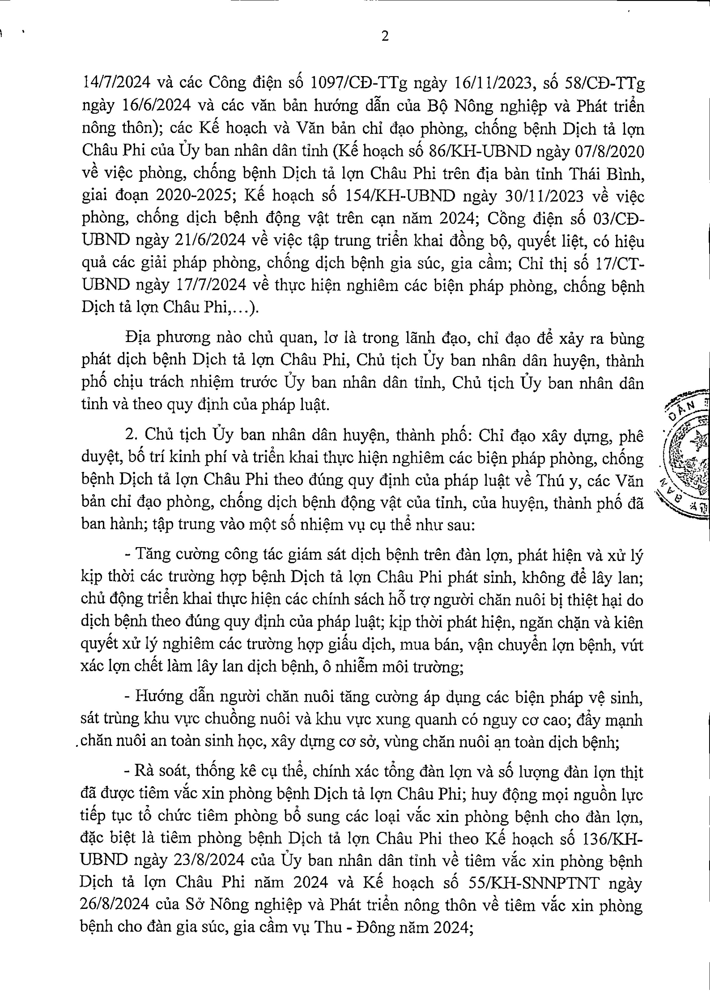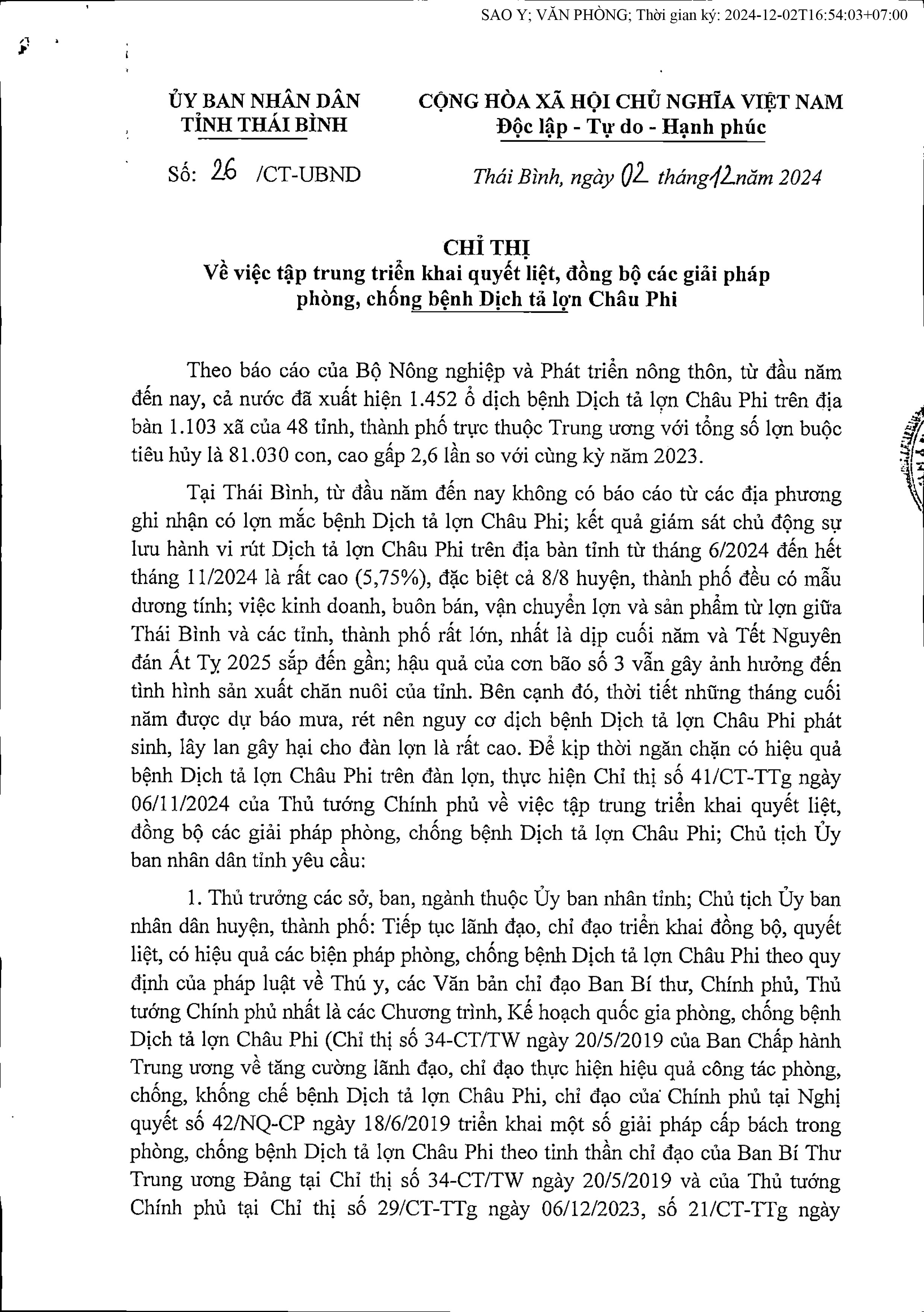 Chỉ thị số 26/CT-UBND ngày 2/12/2024 của Ủy ban nhân dân tỉnh Thái Bình về việc tập trung triển khai quyết liệt, đồng bộ các giải pháp phòng, chống bệnh Dịch tả lợn Châu Phi