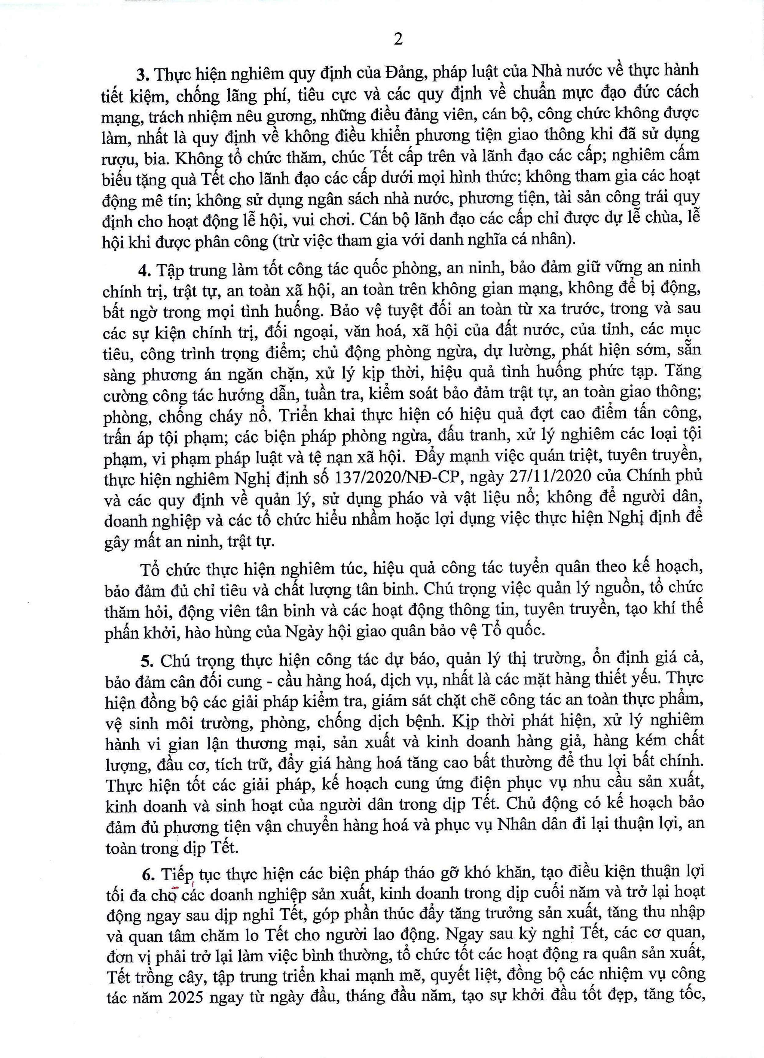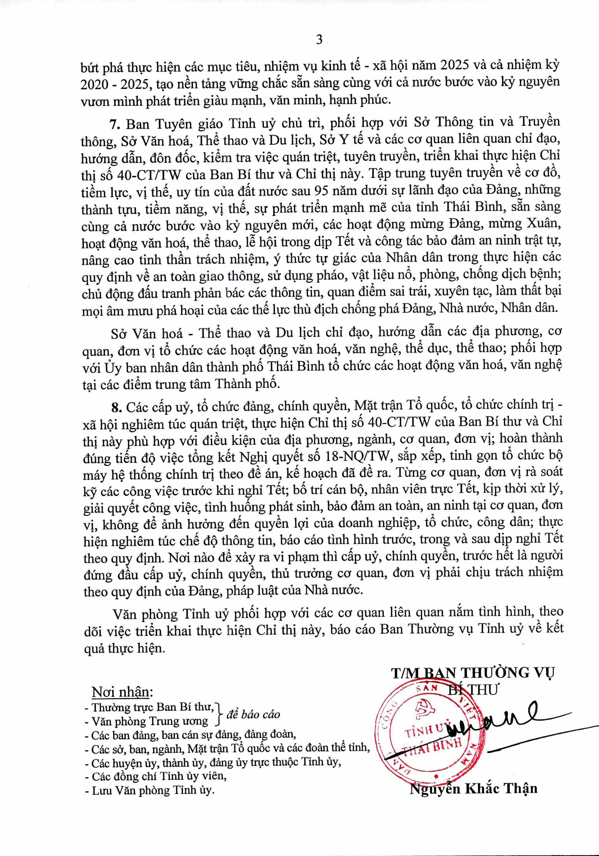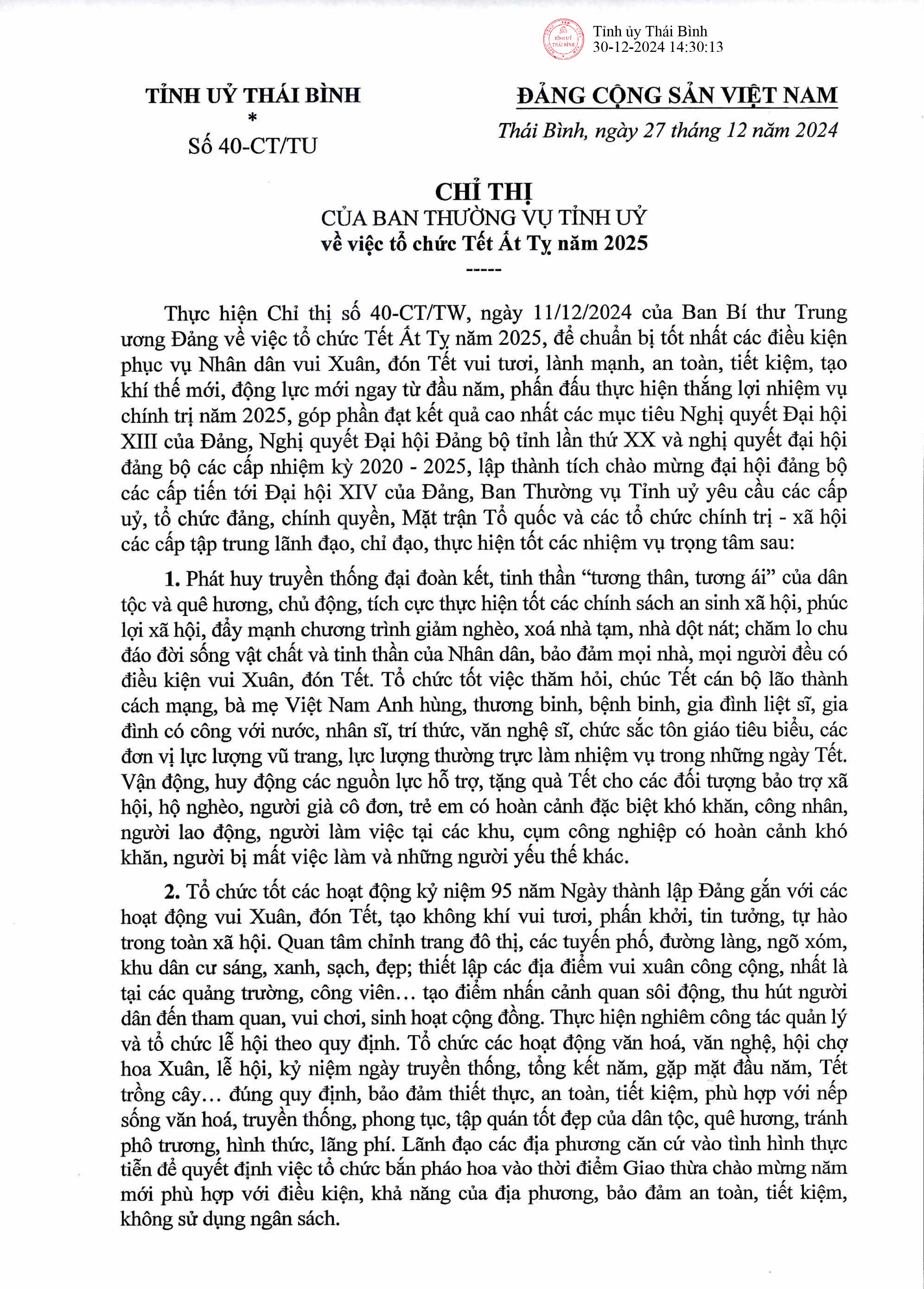 Chỉ thị của Ban Thường vụ Tỉnh ủy về việc tổ chức Tết Ất Tỵ năm 2025