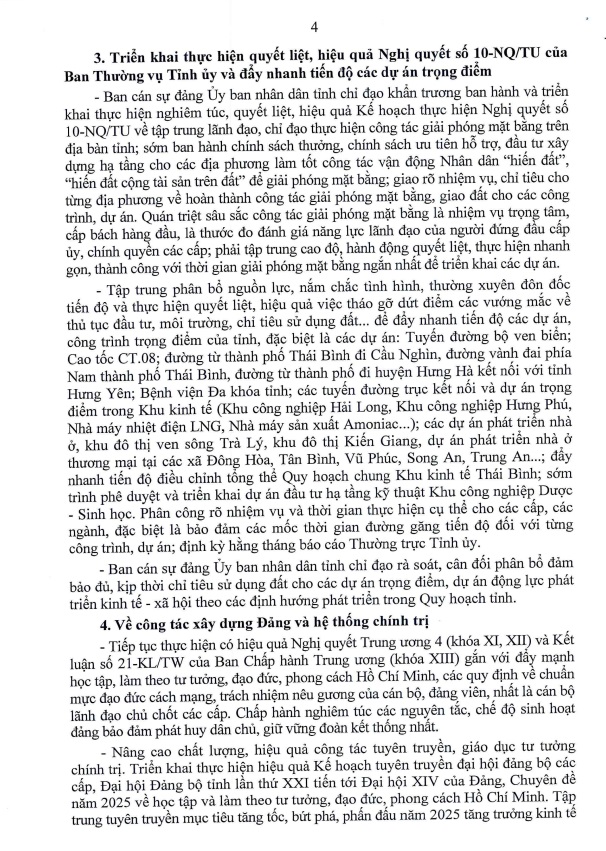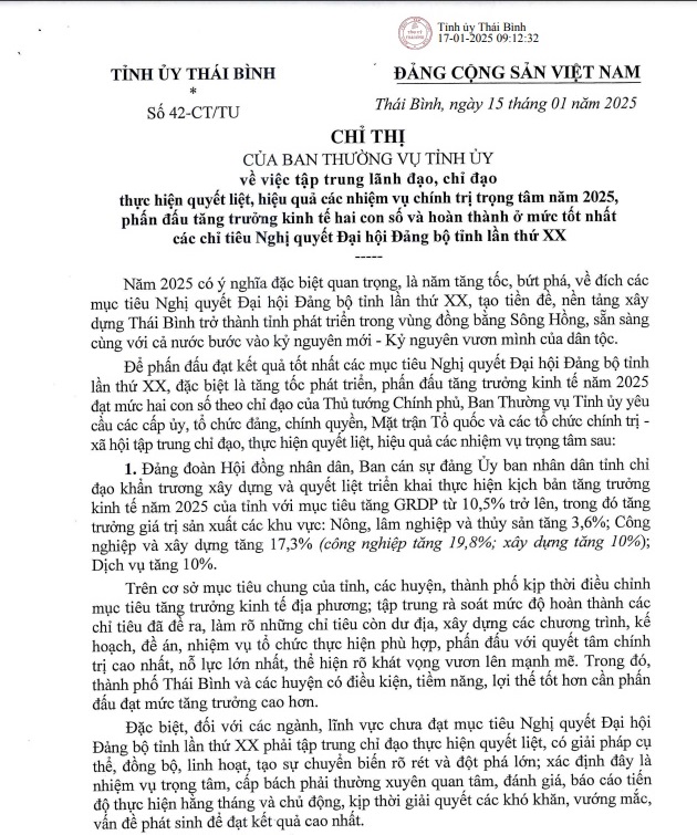 Chỉ thị của Ban Thường vụ Tỉnh ủy về việc tập trung lãnh đạo, chỉ đạo thực hiện quyết liệt, hiệu quả các nhiệm vụ chính trị trọng tâm năm 2025, phấn đấu tăng trưởng kinh tế hai con số và hoàn thành ở mức tốt nhất các chỉ tiêu Nghị quyết Đại hội Đảng bộ tỉnh lần thứ XX.