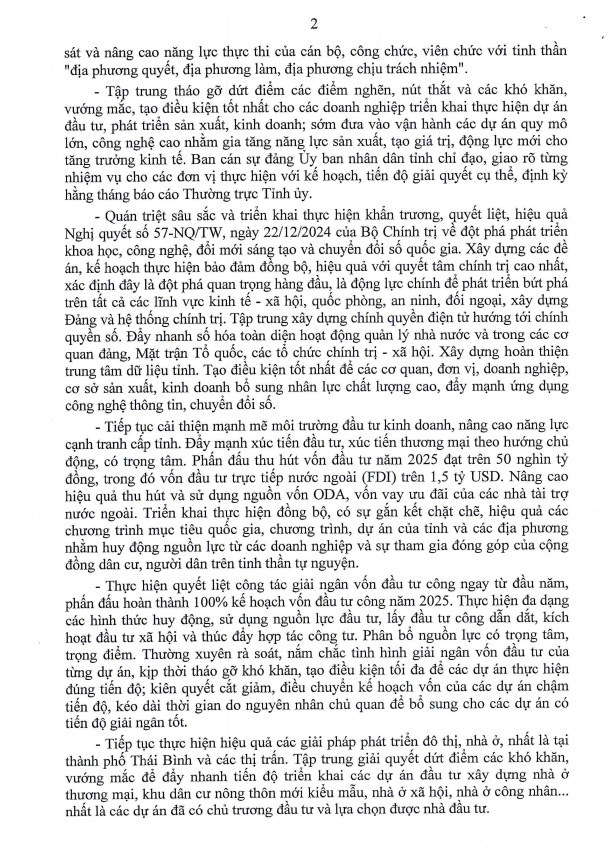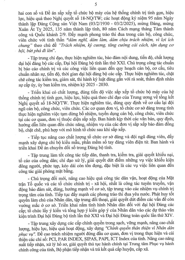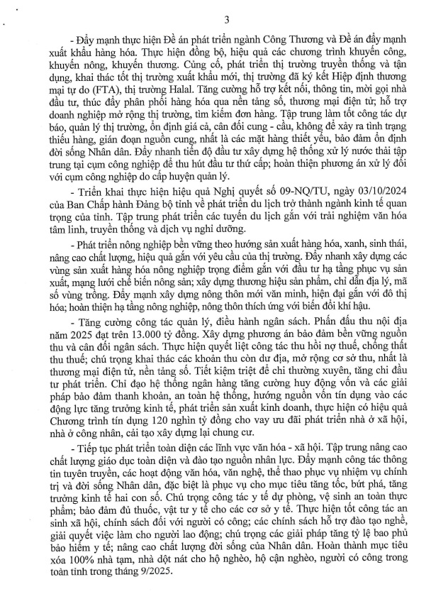 Tập trung lãnh đạo, chỉ đạo thực hiện quyết liệt, hiệu quả các nhiệm vụ chính trị trọng tâm năm 2025, phấn đấu tăng trưởng kinh tế hai con số và hoàn thành ở mức tốt nhất các chỉ tiêu Nghị quyết Đại hội Đảng bộ tỉnh lần thứ XX