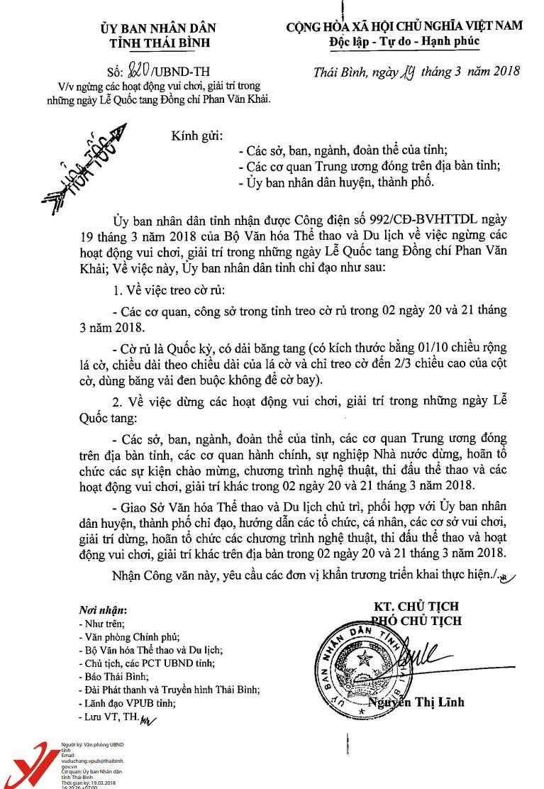 Công văn số 820/UBND-TH ngày 19/3/2018 của UBND tỉnh về việc ngừng các hoạt động vui chơi, giải trí trong những ngày Lễ Quốc tang đồng chí Phan Văn Khải.