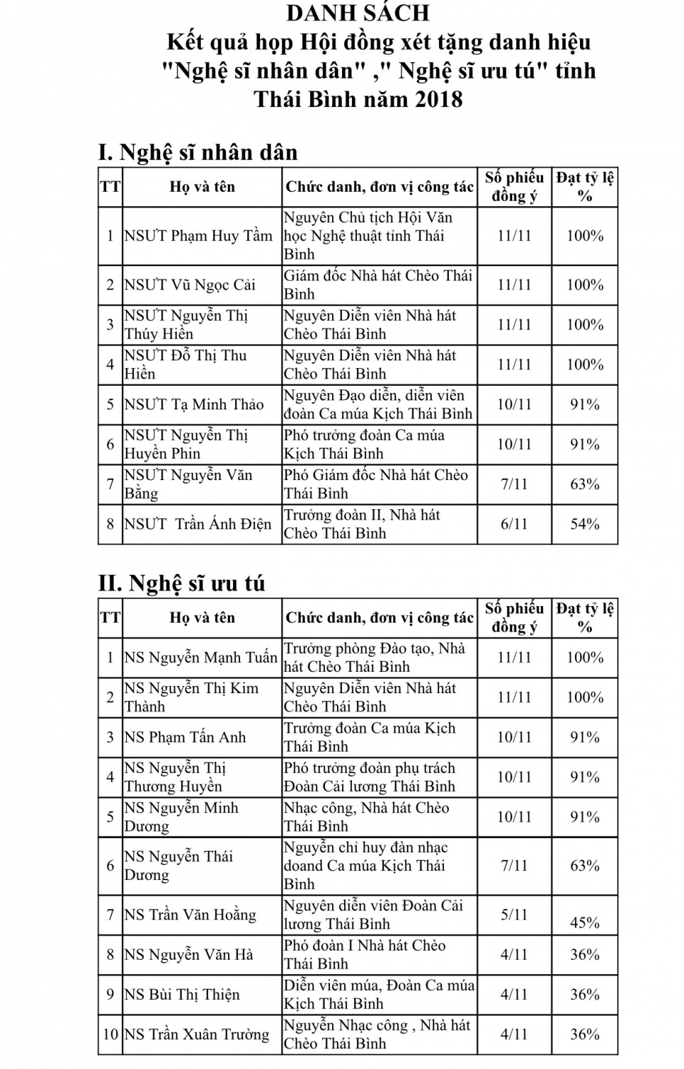 Danh sách kết quả họp Hội đồng xét tặng danh hiệu "Nghệ sĩ nhân dân" ," Nghệ sĩ ưu tú" tỉnh Thái Bình năm 2018
