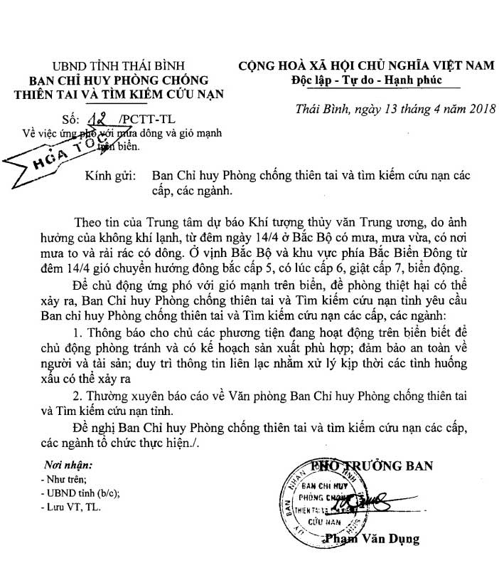 Công văn số 12 về việc ứng phó với gió mạnh trên biển