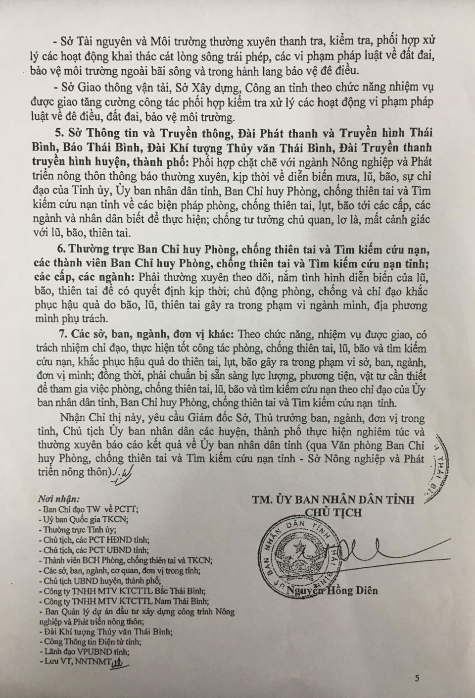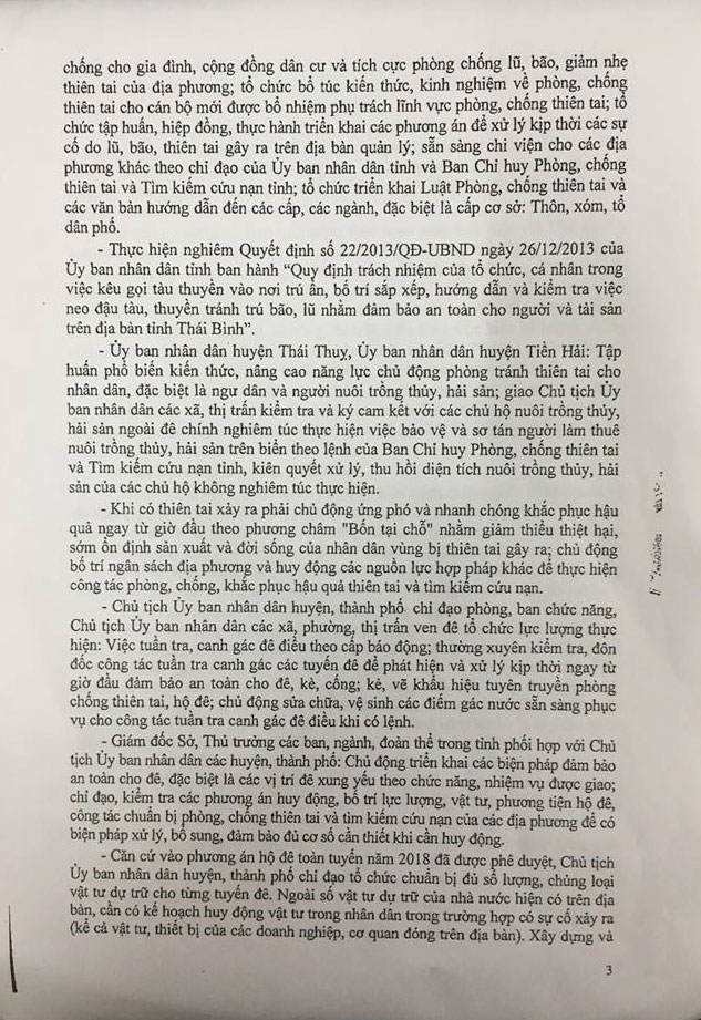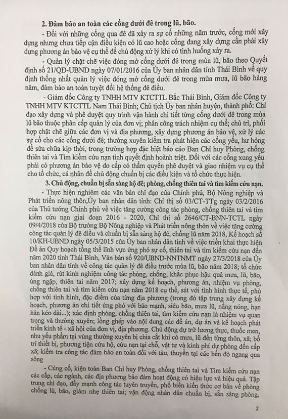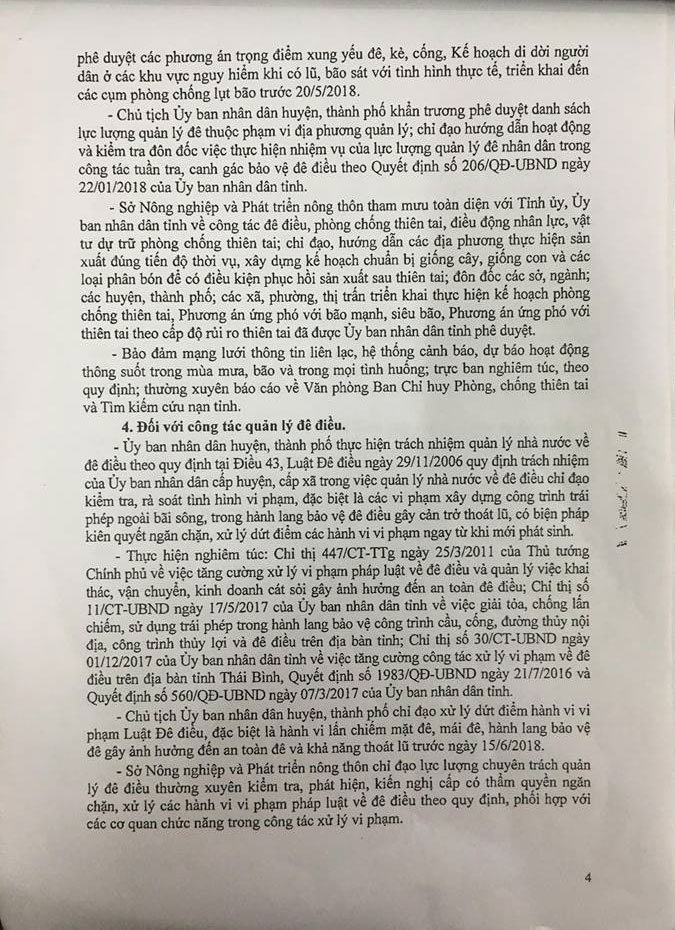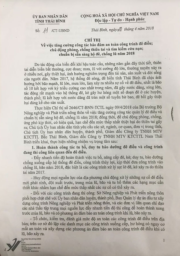 Ngày 20/04/2018, Ủy ban nhân dân tỉnh Thái Bình ra Chỉ thị số 11/CT-UBND về việc tăng cường công tác đảm bảo an toàn công trình đê điều; chủ động phòng, chống thiên tai và tìm kiếm cứu nạn; chuẩn bị sẵn sàng hộ đê, chống lũ năm 2018