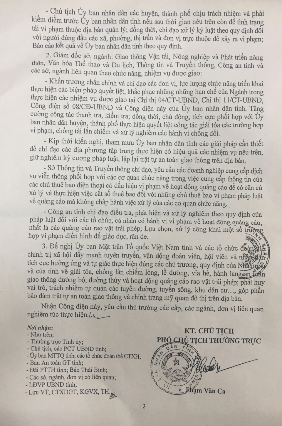 Công điện số 06 của UBND tỉnh về việc tăng cường các biện pháp xử lý tái lấn chiếm, sử dụng trái phép vỉa hè, lòng, lề đường, hành lang an toàn giao thông đường bộ, đường thủy và quảng cáo rao vặt trái phép trên địa bàn tỉnh