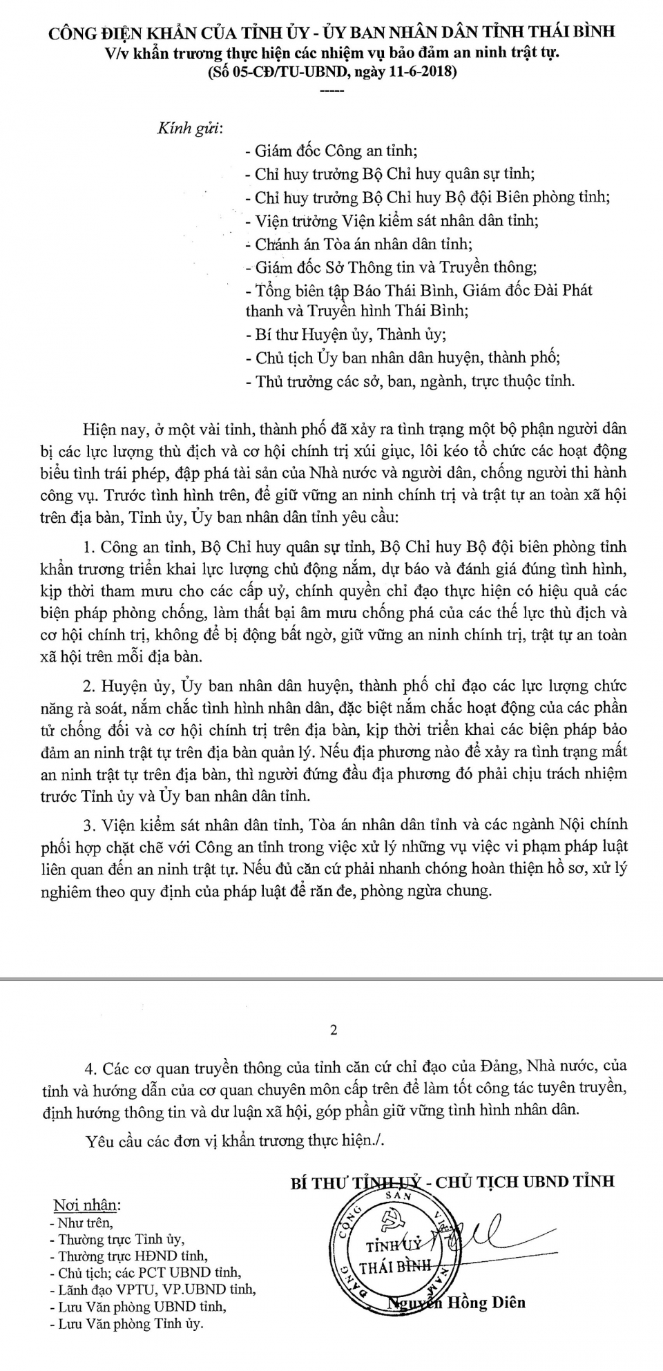Ngày 11/06/2018, Tỉnh ủy - Ủy ban nhân dân tỉnh Thái Bình ra Công điện khẩn số 05-CĐ/TU-UBND về việc khẩn trương thực hiện các nhiệm vụ bảo đảm an ninh trật tự.