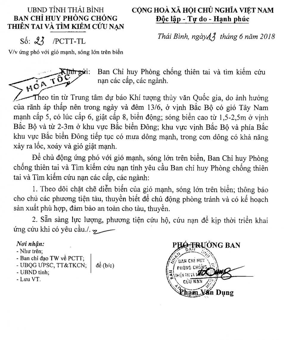 Công văn số 23/PCTT-TL ngày 13/6/2018 của Ban chỉ huy Phòng chống thiên tai và TKCN tỉnh về việc ứng phó với gió mạnh, sóng lớn trên biển.