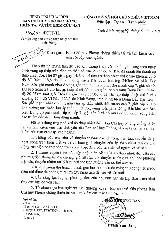 Ngày 14/6/2018, Ban chỉ huy Phòng chống thiên tai và TKCN tỉnh Thái Bình ra công văn số 24/PCTT-TL về việc ứng phó với áp thấp nhiệt đới trên biển Đông.