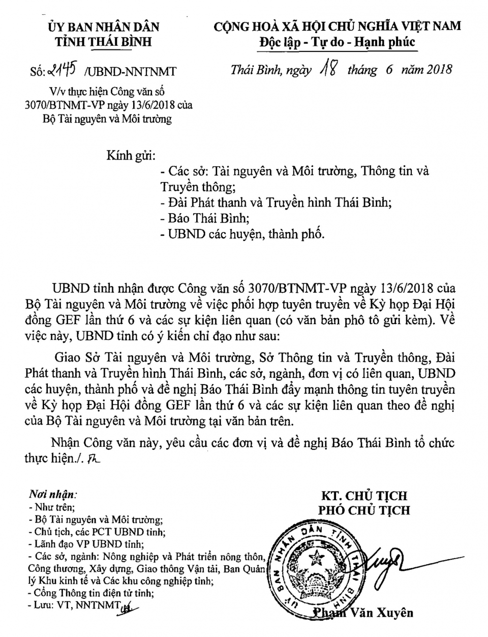 Ngày 18/6/2018, Ủy ban nhân dân tỉnh Thái Bình ra Công văn số 2145/UBND-NNTNMT về việc thực hiện Công văn số 3070/BTNMT-VP ngày 13/6/2018 của Bộ Tài nguyên và Môi trường.
