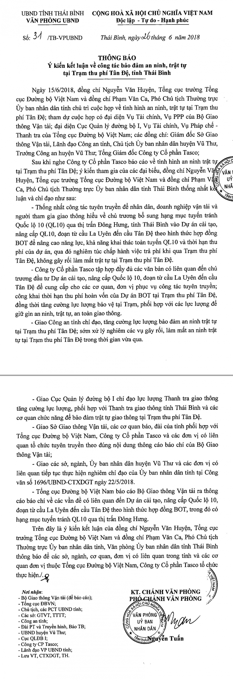 Ngày 26/6/2018, Văn phòng UBND tỉnh Thái Bình ra Công văn số 31-TB-VPUBND về ý kiến kết luận về công tác bảo đảm an ninh, trật tự tại Trạm thu phí Tân Đệ, tỉnh Thái Bình.
