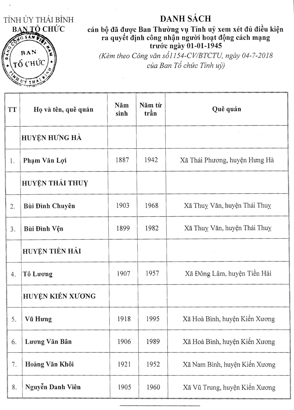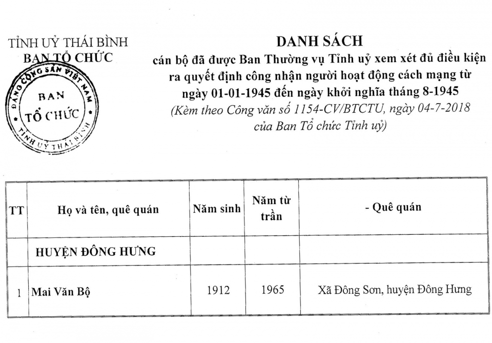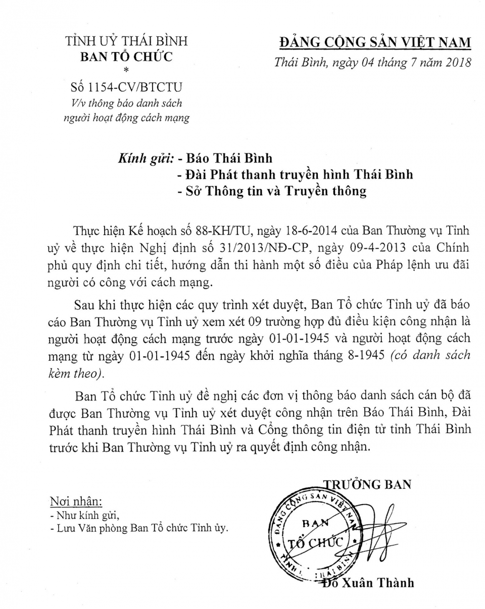 Ngày 4/7/2018, Ban Tổ chức Tỉnh ủy ra Công văn 1154 -CV/BTCTU về việc thông báo danh sách người hoạt động cách mạng.