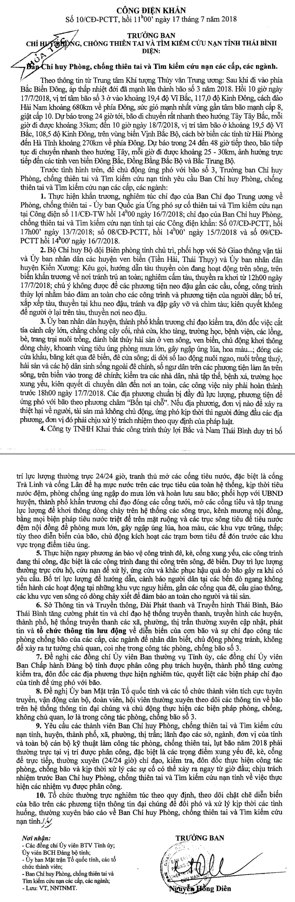 Hồi 11h00' ngày 17/7/2018, Ban chỉ huy Phòng chống thiên tai và TKCN tỉnh Thái Bình có Công điện khẩn số 10/CĐ-PCTT gửi Ban chỉ huy Phòng, chống thiên tai và Tìm kiếm cứu nạn các cấp, các ngành.