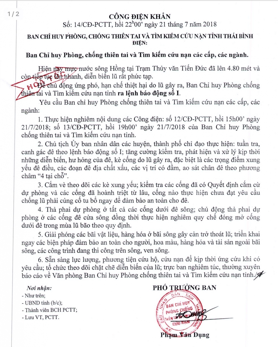 Hồi 22h00' ngày 21/7/2018 Ban Chỉ huy Phòng chống thiên tai và TKCN tỉnh Thái Bình ra Công điện khẩn số 14/CĐ-PCTT gửi Ban Chỉ