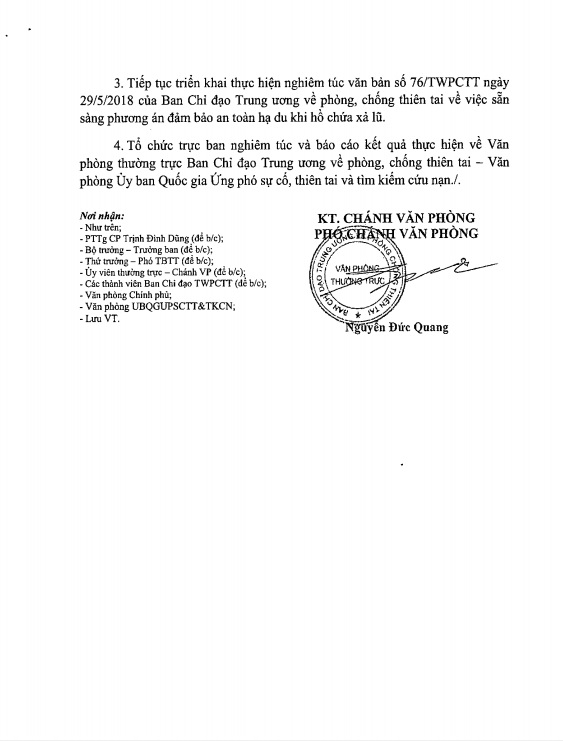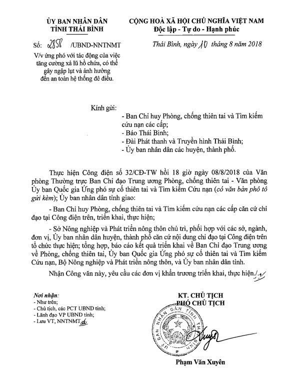 Công văn số 2858 của UBND tỉnh về việc đối phó với tác động của việc tăng cường xả lũ hồ chứa, có thể gây ngập lụt và ảnh hưởng đến hệ thống đê điều