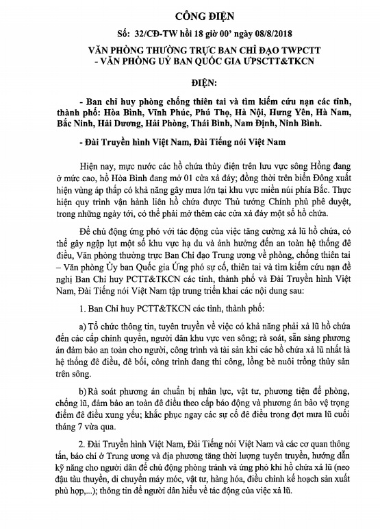 - Công điện số 18 của Ban Chỉ huy PCTT và TKCN tỉnh điện Ban Chỉ huy PCTT và TKCN các cấp, các ngành 13.09.2024 | 10:36 AM