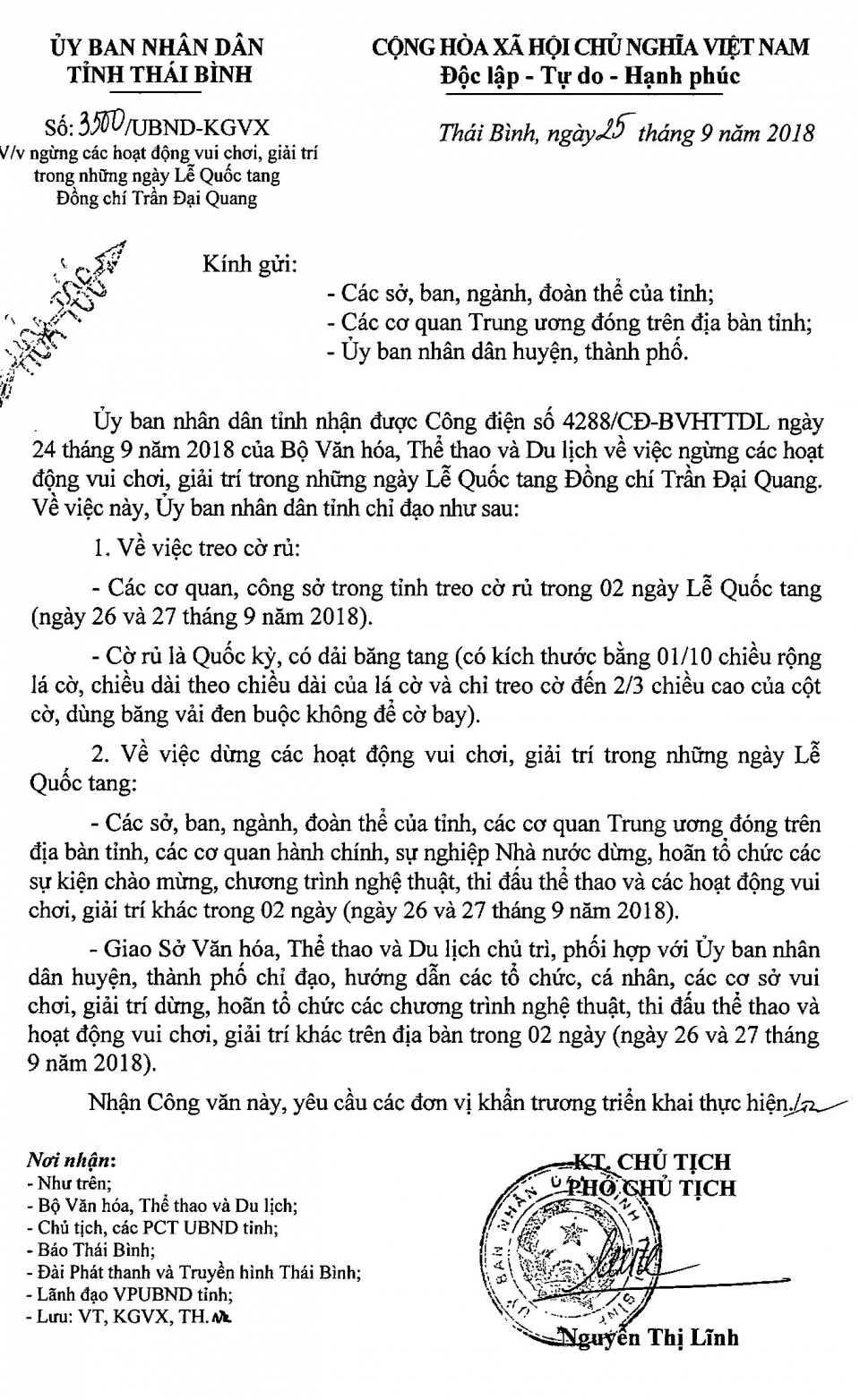 Ngày 25/9/2018, Ủy ban nhân dân tỉnh Thái Bình ra Công văn số 3500/UBND- KGVX về việc ngừng các hoạt động vui chơi, giải trí trong những ngày Lễ Quốc tang đồng chí Trần Đại Quang.