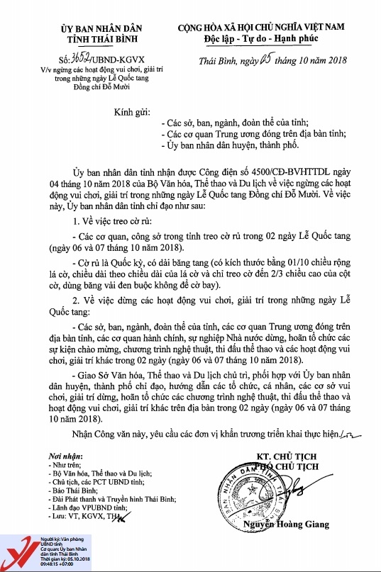 Ngày 5/10/2018, Ủy ban nhân dân tỉnh Thái Bình ra Công văn số 3652/UBND-KGVX về việc ngừng các hoạt động vui chơi, giải trí trong những ngày Lễ Quốc tang đồng chí Đỗ Mười.