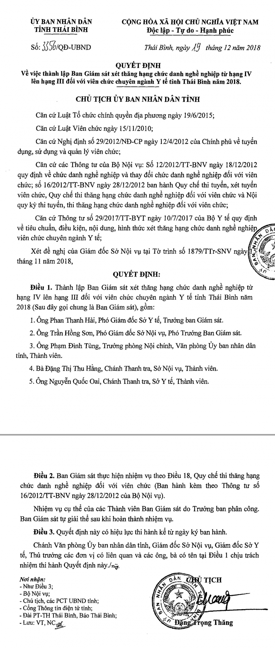 Ngày 19/12/2018, Ủy ban nhân dân tỉnh ra Quyết định số 3356/QĐ-UBND về việc thành lập Ban Giám sát xét thăng hạng chức danh nghề nghiệp từ hạng IV lên hạng III đối với viên chức chuyên ngành Y tế tỉnh Thái Bình năm 2018