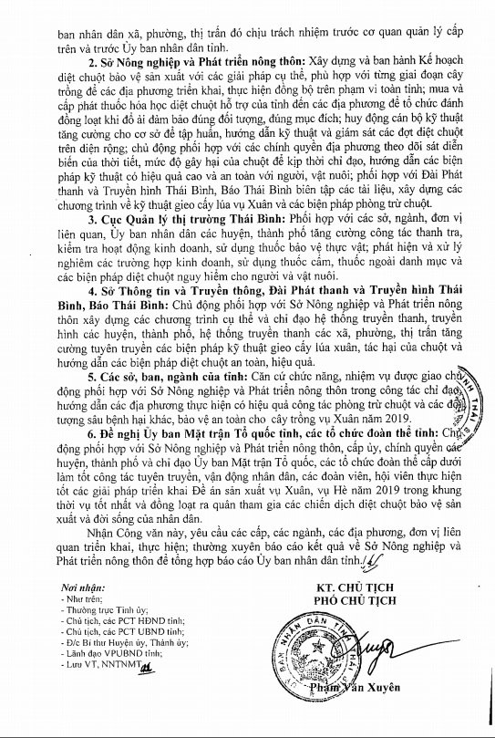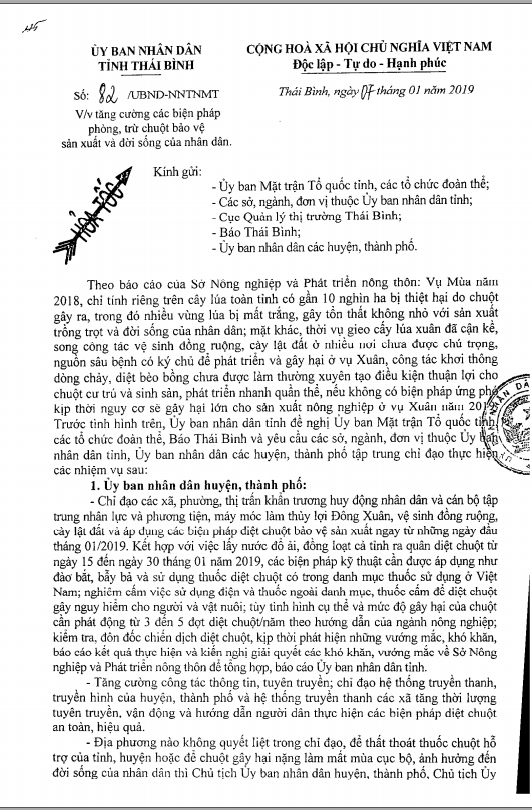 Ngày 07/1/2019, Ủy ban nhân dân tỉnh Thái Bình ra công văn số 82/UBND-NNTNMT về việc tăng cường các biện pháp phòng, trừ chuột bảo vệ sản xuất và đời sống của nhân dân
