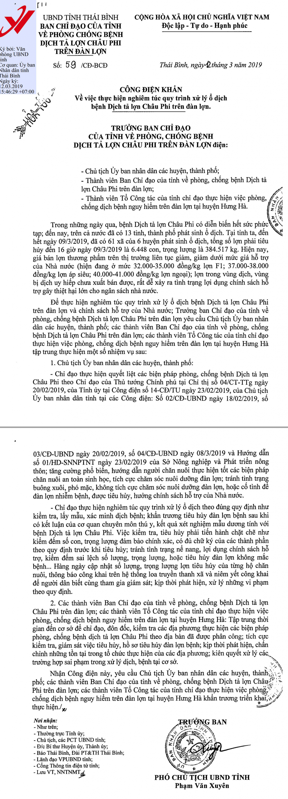 Ngày 12/3/2019, Ban Chỉ đạo của tỉnh về phòng chống bệnh dịch tả lợn châu Phi trên đàn lợn ra Công điện số 59/CĐ-BCĐ về việc thực hiện nghiêm túc quy trình xử lý ổ dịch bệnh dịch tả lợn châu Phi trên đàn lợn.