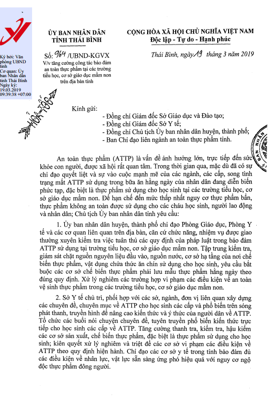 Ngày 19/3, UBND tỉnh ra công văn số 964/UBND-KGVX về việc tăng cường công tác bảo đảm an toàn thực phẩm tại các trường tiểu học, cơ sở giáo dục mầm non trên địa bàn tỉnh