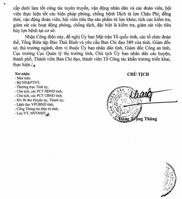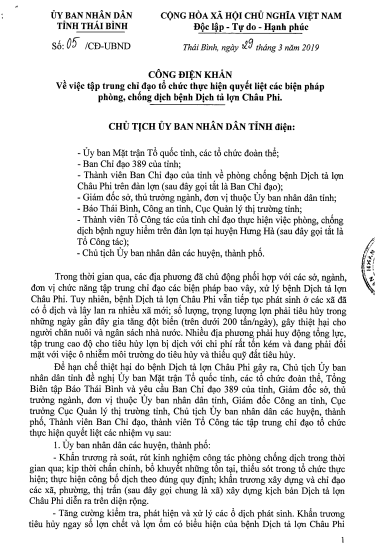 Công điện khẩn số 05 về việc tập trung chỉ đạo tổ chức thực hiện quyết liệt các biện pháp phòng, chống dịch bệnh dịch tả lợn châu Phi