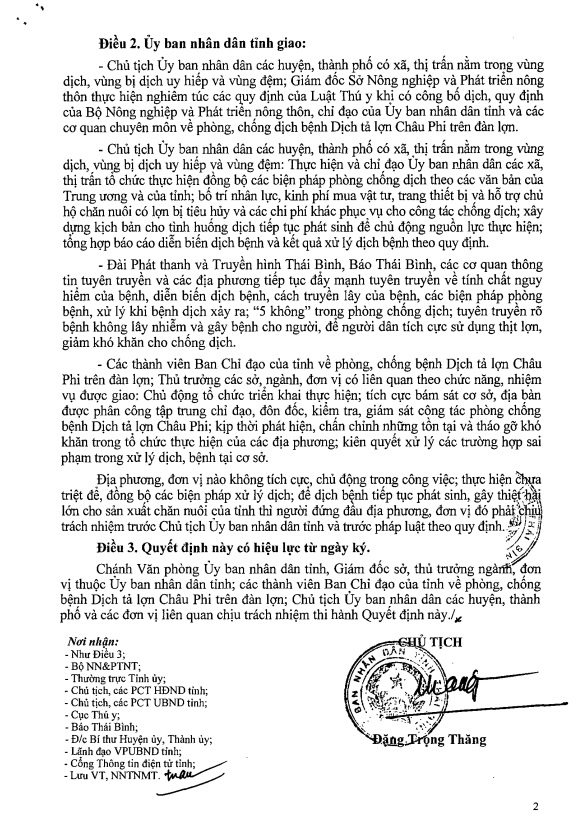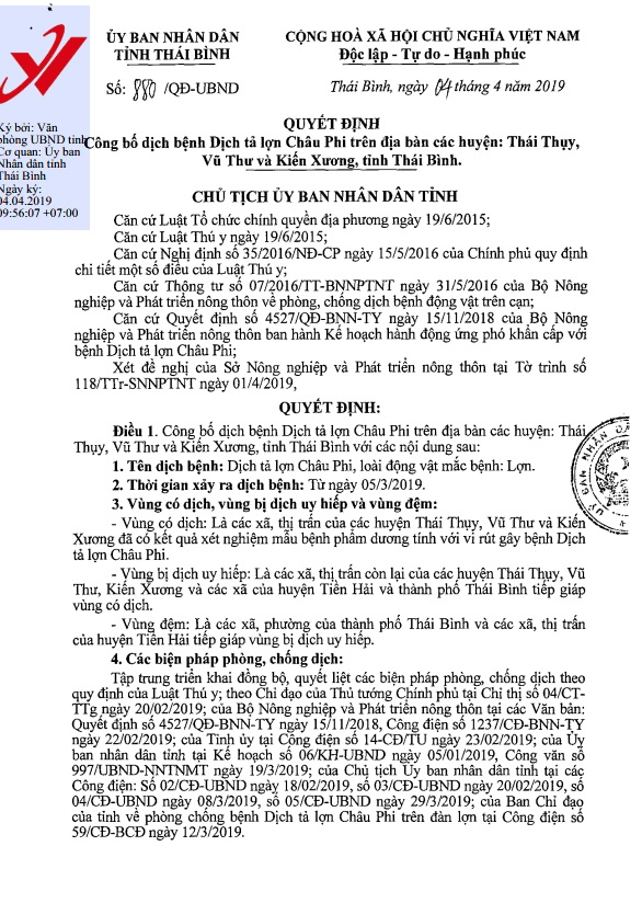 Ngày 4/4, Ủy ban nhân dân tỉnh ra quyết định số 880/QĐ-UBND về việc công bố dịch bệnh dịch tả lợn châu Phi trên địa bàn các huyện: Thái Thụy, Vũ Thư và Kiến Xương, tỉnh Thái Bình.