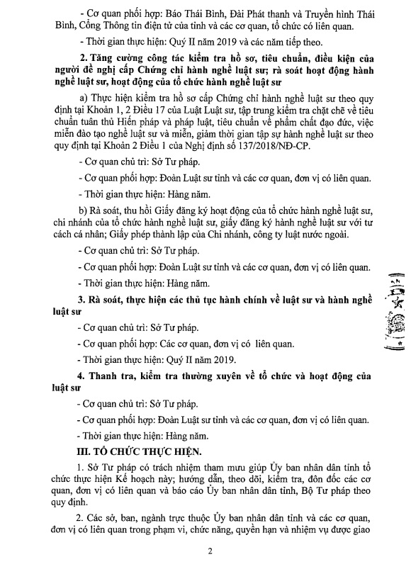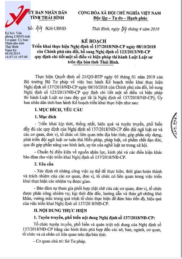 Ngày 4/4, Ủy ban nhân dân tỉnh ra kế hoạch số 44/KH-UBND về việc triển khai thực hiện Nghị định số 137/2018/NĐ-CP ngày 08/10/2018 của Chính phủ sửa đổi, bổ sung Nghị định số 123/2013/NĐ-CP quy định chi tiết một số điều và biện pháp thi hành Luật Luật sư trên địa bàn tỉnh Thái Bình.