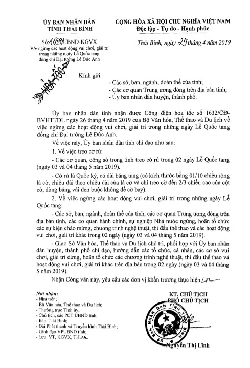 Công văn số 16591 của Ủy ban nhân dân tỉnh về việc ngừng các hoạt động vui chơi, giải trí trong những ngày Lễ Quốc tang đồng chí Đại tướng Lê Đức Anh