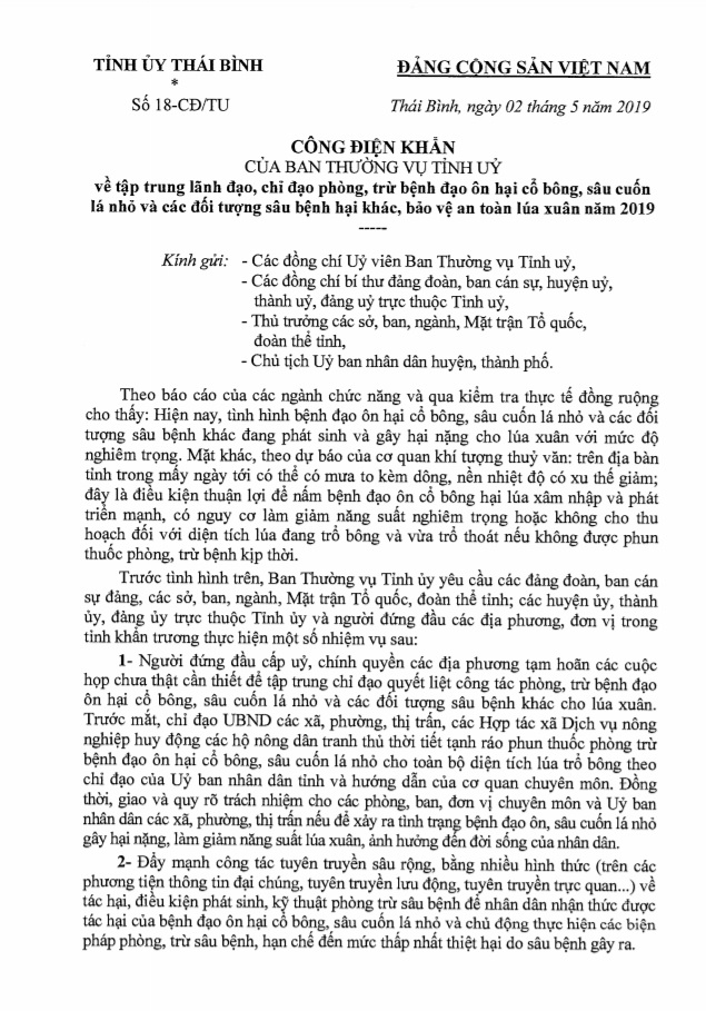 Công điện khẩn số 18 của Ban Thường vụ Tỉnh ủy về việc tập trung lãnh đạo, chỉ đạo phòng, trừ bệnh đạo ôn hại cổ bông, sâu cuốn lá nhỏ và các đối tượng sâu bệnh hại khác, bảo vệ an toàn lúa xuân năm 2019