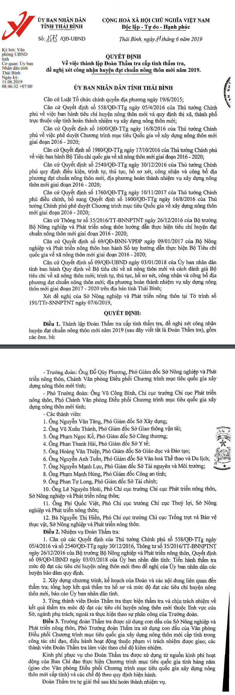 Quyết định số 1573 của UBND tỉnh về việc thành lập Đoàn Thẩm tra cấp tỉnh thẩm tra, đề nghị xét công nhận huyện đạt chuẩn nông thôn mới năm 2019