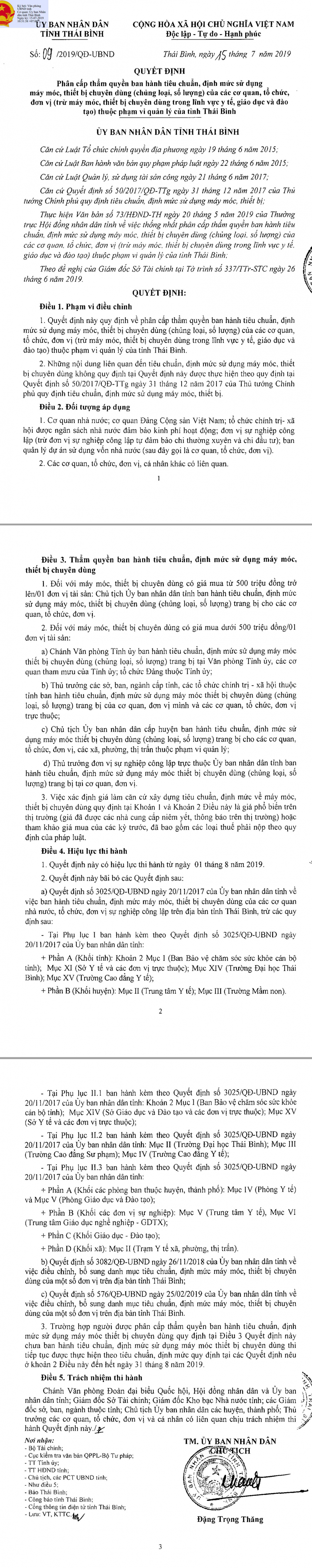 Ngày 15/7/2019, Ủy ban nhân dân tỉnh Thái Bình ra Quyết định số 09/2019/QĐ - UBND về việc phân cấp thẩm quyền ban hành tiêu chuẩn, định mức sử dụng máy móc, thiết bị chuyên dùng (chủng loại, số lượng) của các cơ quan, tổ chức, đơn vị (trừ máy móc, thiết bị chuyên dùng trong lĩnh vực y tế, giáo dục và đào tạo) thuộc phạm vi quản lý của tỉnh Thái Bình.