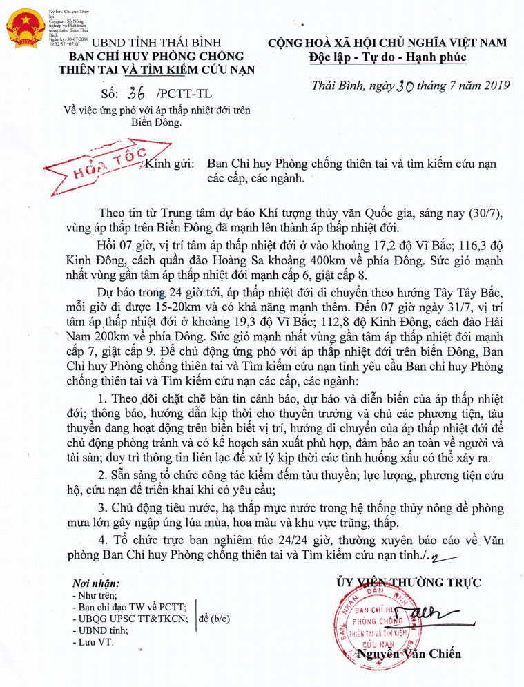 Công văn hỏa tốc số 36/PCTT-TL về việc ứng phó với áp thấp nhiệt đới trên biển Đông