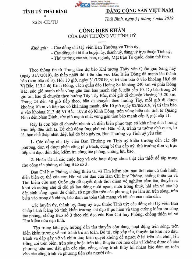 Ngày 31/7/2019, Ban Thường vụ Tỉnh ủy ra Công điện khẩn số 21-CĐ/TU.