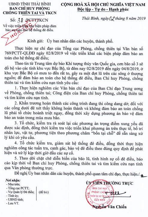 Ngày 02/8, Ban Chỉ huy Phòng, chống thiên tai và Tìm kiếm cứu nạn tỉnh có Công văn hỏa tốc số 38/PCTTTKCN gửi UBND các huyện, thành phố về việc triển khai các biện pháp bảo đảm an toàn cho hệ thống đê điều.