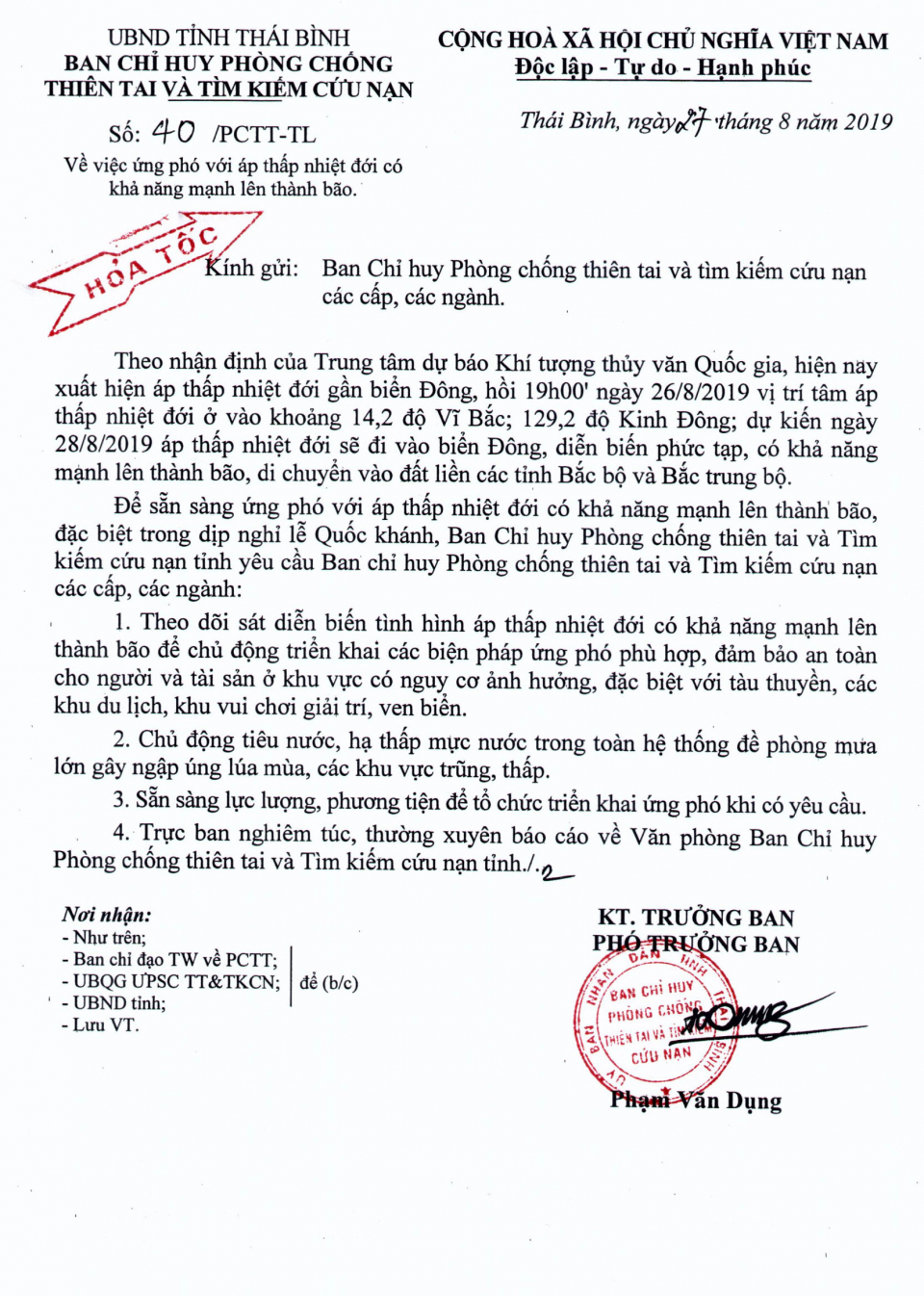 - Công điện khẩn số 10 của Ban chỉ huy PCTT và TKCN tỉnh Thái Bình điện Ban chỉ huy PCTT và TKCN các cấp, các ngành 03.09.2024 | 22:24 PM
