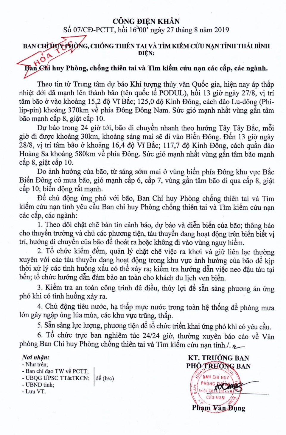 Ngày 27/8/2019, Ban Chỉ huy Phòng, chống thiên tai và Tìm kiếm cứu nạn tỉnh Thái Bình có Công điện khẩn số 07/CĐ-PCTT điện cho Ban chỉ huy phòng chống thiên tai và tìm kiếm cứu nạn các cấp, các ngành.