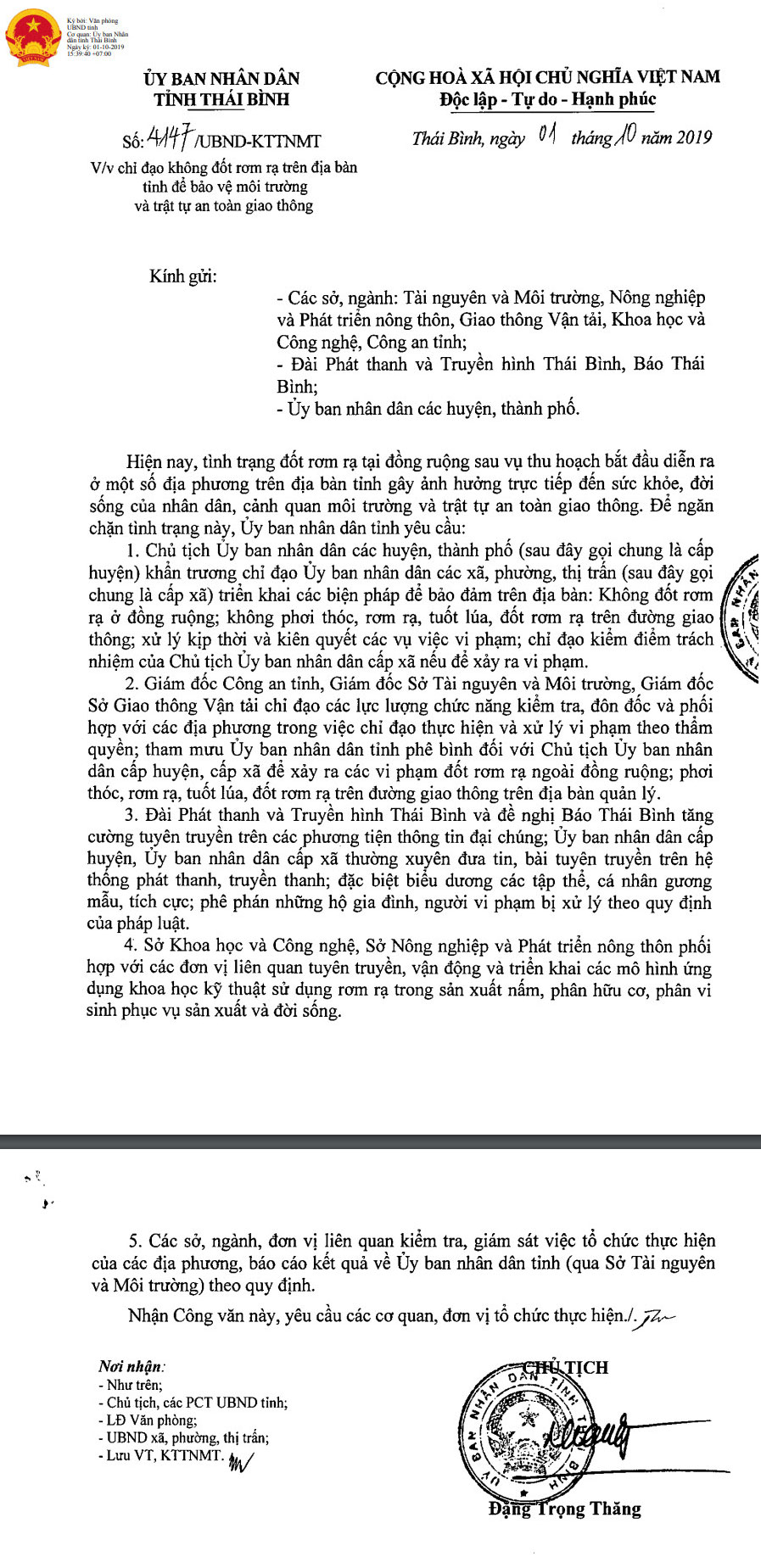 Ngày 01/10/2019 Ủy ban nhân dân tỉnh Thái Bình ra Công văn số 4147 về việc chỉ đạo không đốt rơm rạ trên địa bàn tỉnh để bảo vệ môi trường và trật tự an toàn giao thông.