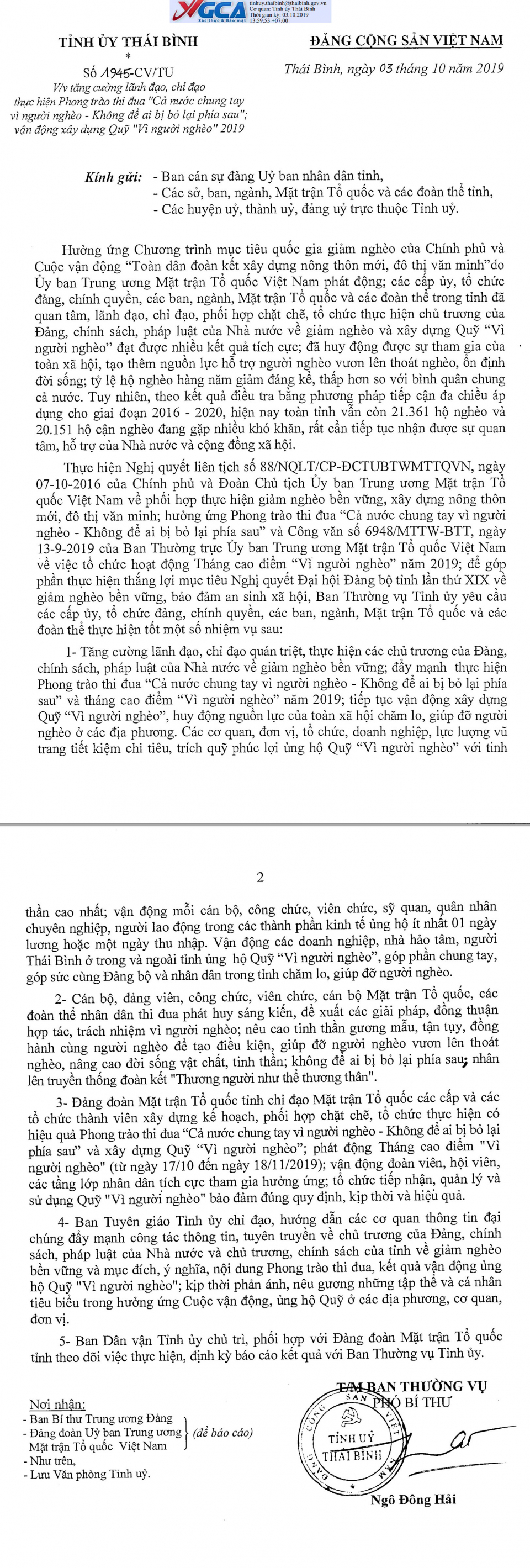 Ngày 03/10/2019, Tỉnh ủy Thái Bình ra Công văn số 1945-CV/TU về việc tăng cường sự lãnh đạo, chỉ đạo thực hiện Phong trào thi đua "Cả nước chung tay vì người nghèo - Không để ai bị bỏ lại phía sau"; vận động xây dựng quỹ "Vì người nghèo" 2019 .